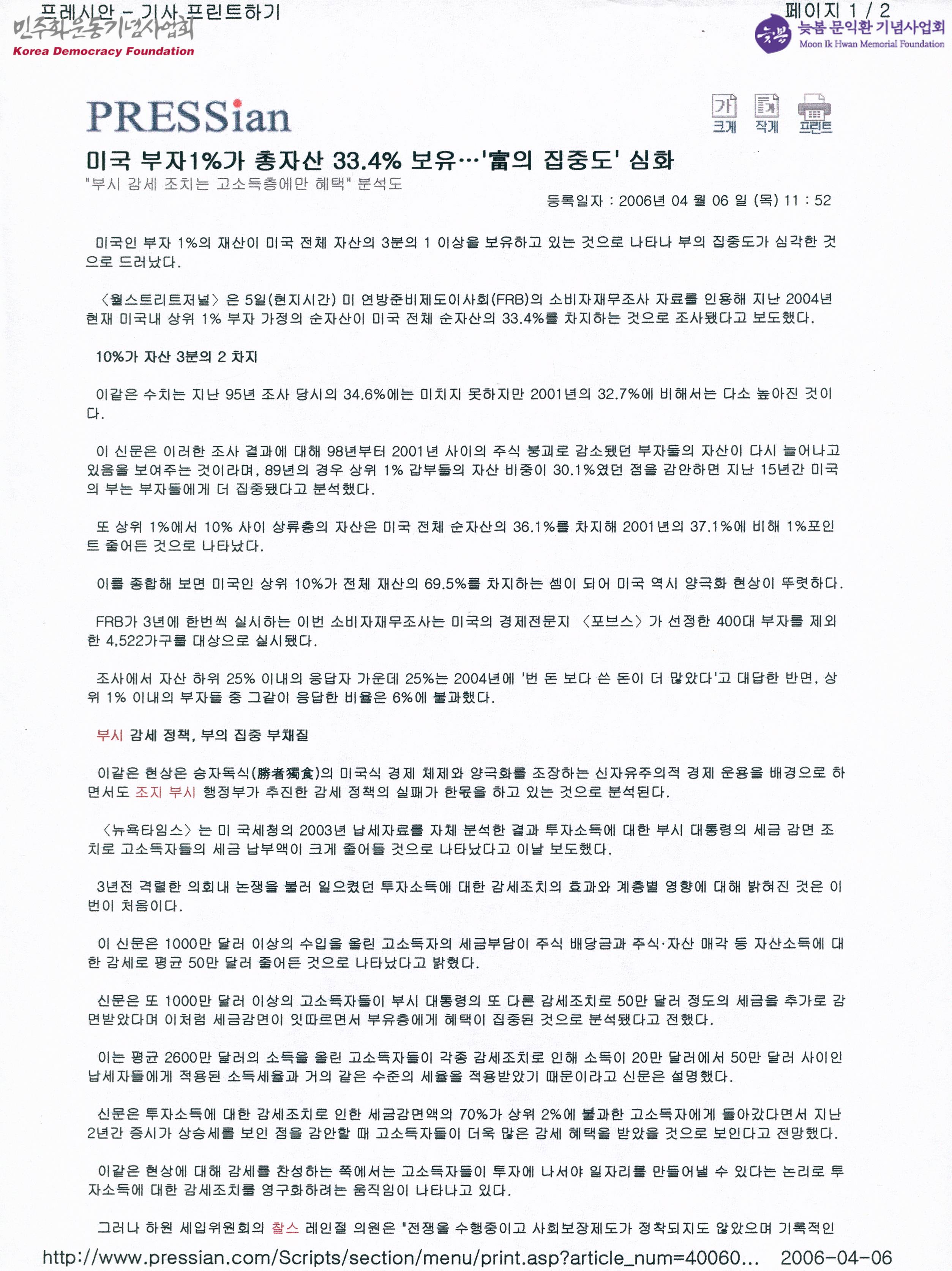 - 「월스트리트저널」이 미국인 부자 1%가 미국 전체 자산의 3분의 1 이상을 보유하고 있다는 조사결과를 보도하고 이에 대해 「뉴욕타임스」가 조지 부시 행정부의 감세 정책을 원인으로 분석했다는 내용의 인터넷 기사 스크랩