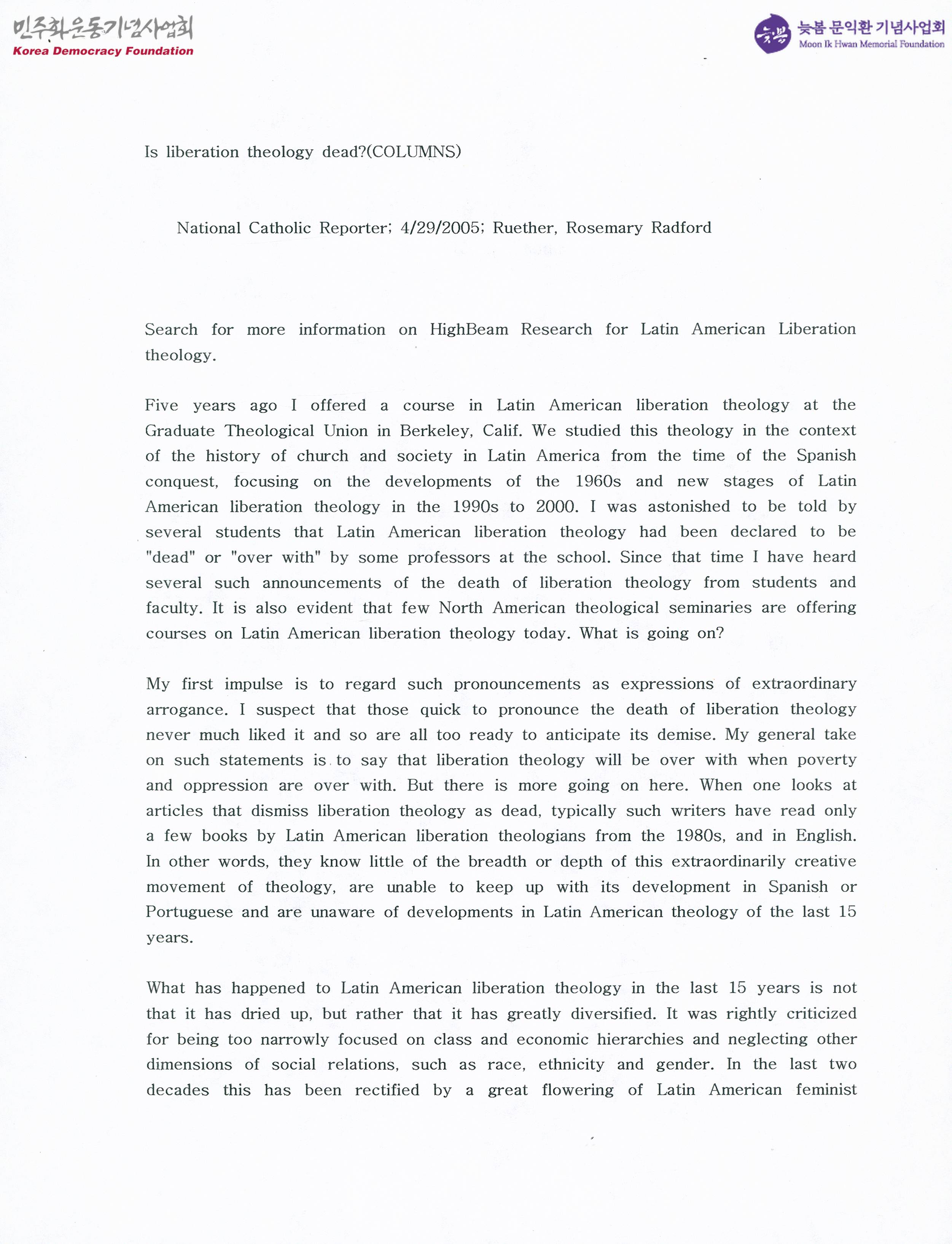 - 해방신학은 끝이 난 것이 아니라, 다양한 방향으로 확장된 것이라는 주장과 해방신학의 죽음을 성급히 선언하는 모습은 미국의 편협해지는 의식을 보여주는 것이라는 내용의 글이 실린 문서