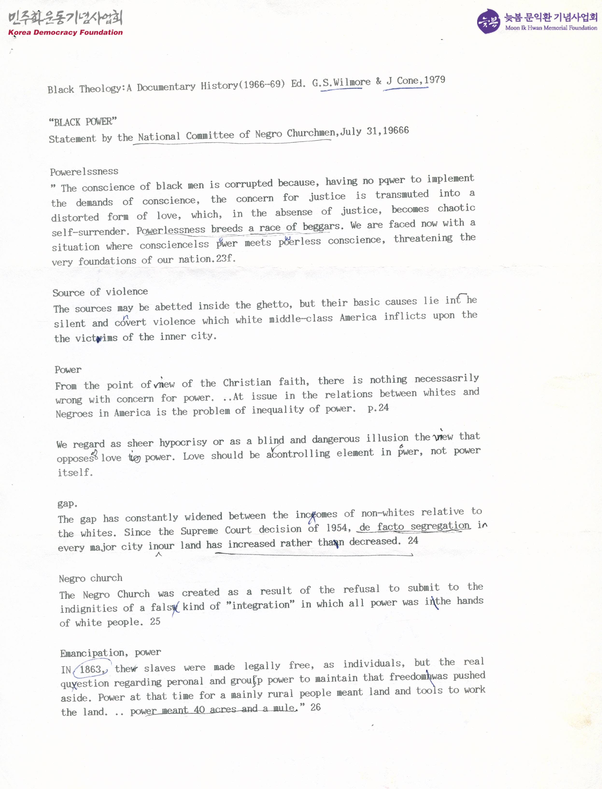 - 미국 전국흑인교회위원회의 성명서의 내용과 흑인신학에 대한 여러 학자들의 글 등이 실린 문서
