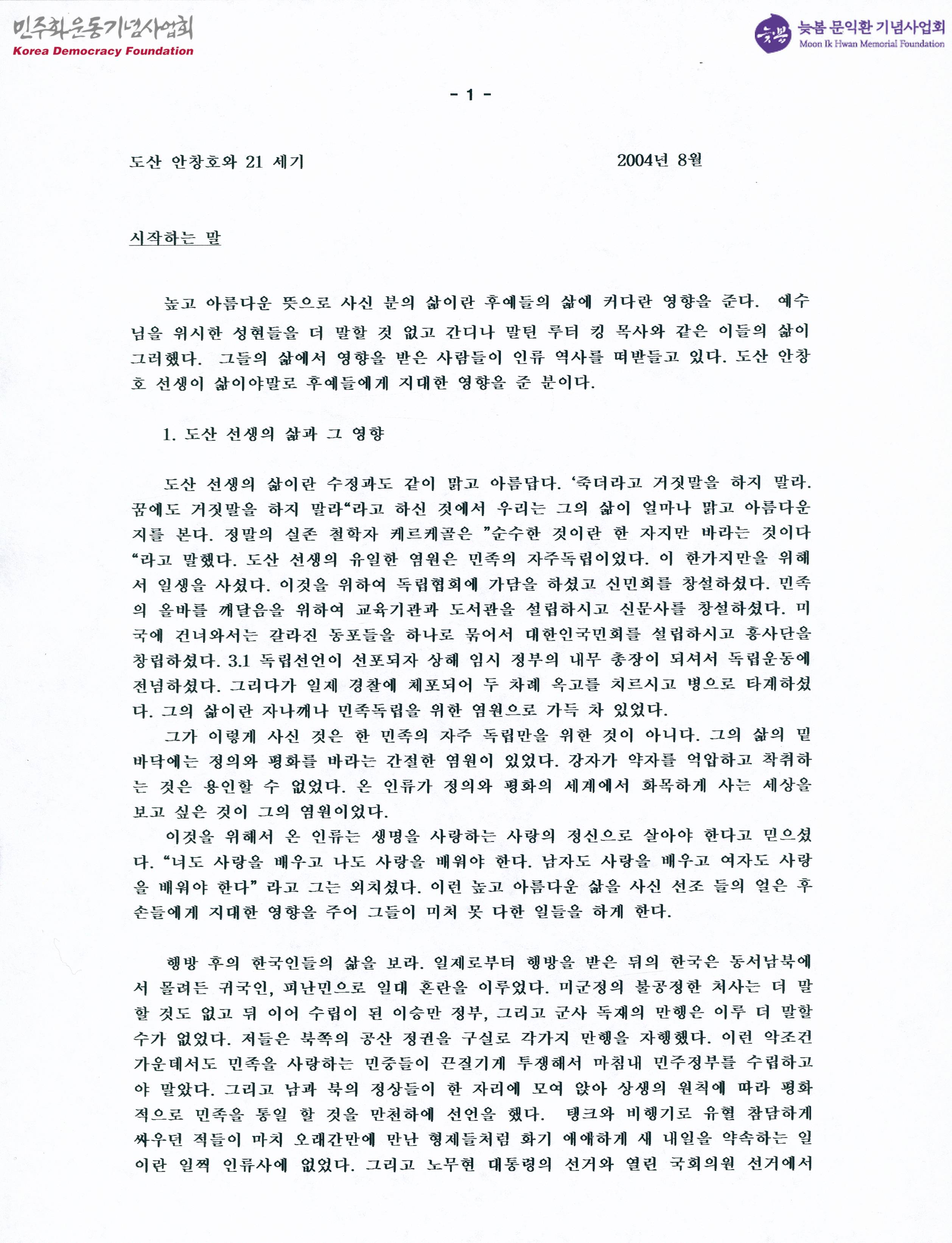 - 순수하게 민족통일을 위한 염원과 거짓없는 삶을 살던 안창호가 국민들에게 끼친 영향과 안창호를 삶을 기리기 위한 삶을 사는 방법 등이 적힌 강연록으로 목차는 다음과 같음 -시작하는 말 1. 도산 선생의 삶과 그 영향 2. 21세기와 안창호 3. 문화혁명 4. 성서의 생명문화 -맺는 말