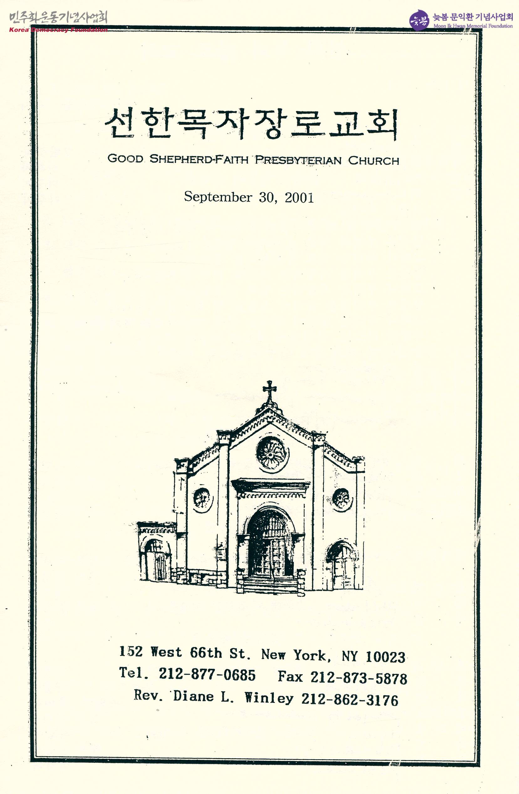 - "군대 마귀와의 싸움"이란 설교가 포함된 예배순서, 희생자 가족을 돕는 일로 여선교회가 바자회를 주최한다는 광고, 주일 예배 및 안내 등이 수록된 주보