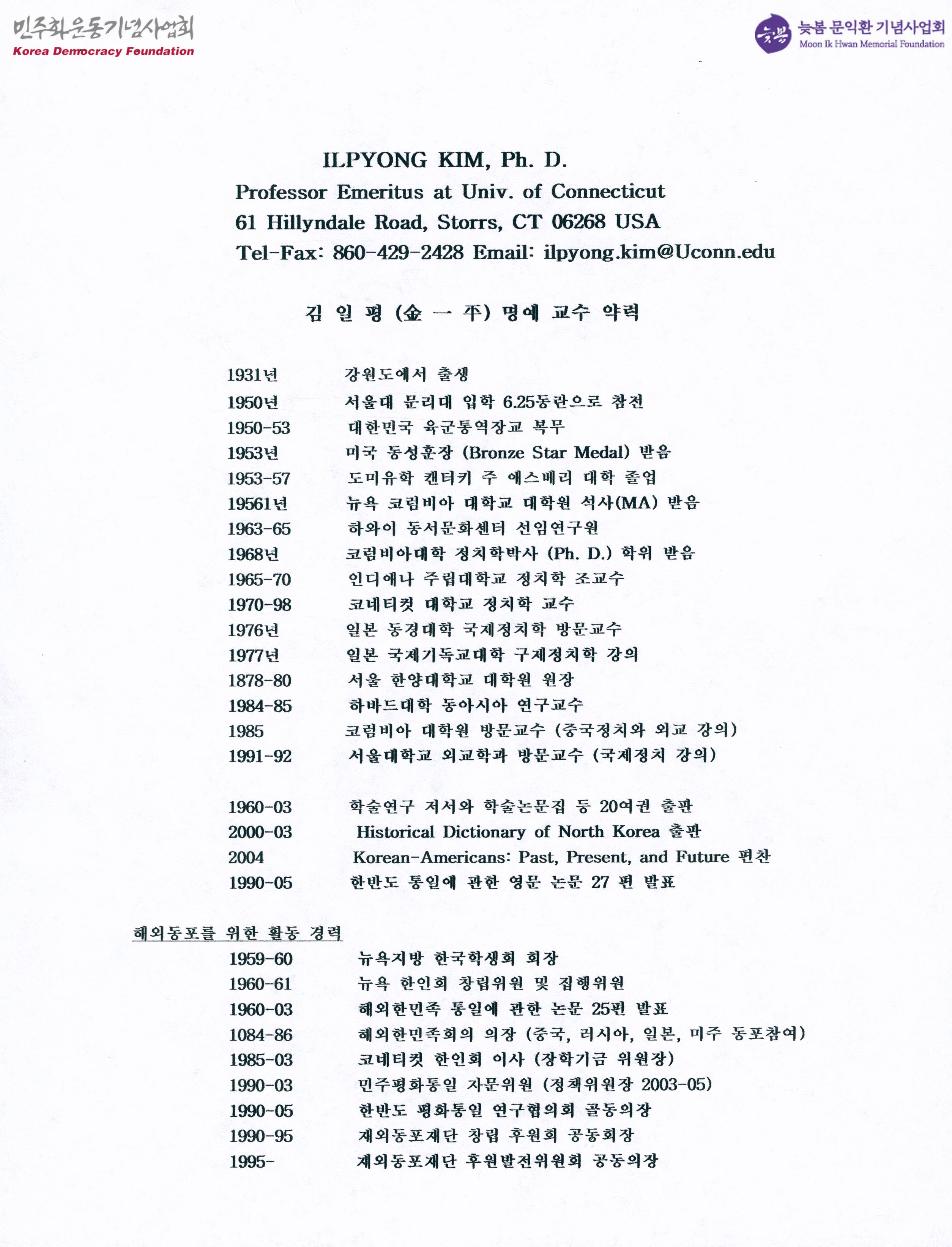 - 해외동포를 위해 뉴욕 한인회를 창립하고 민주평화통일 자문위원과 재외동포재단 창립 후원회 공동회장 등을 역임했던 김일평 교수의 약력이 적힌 문서