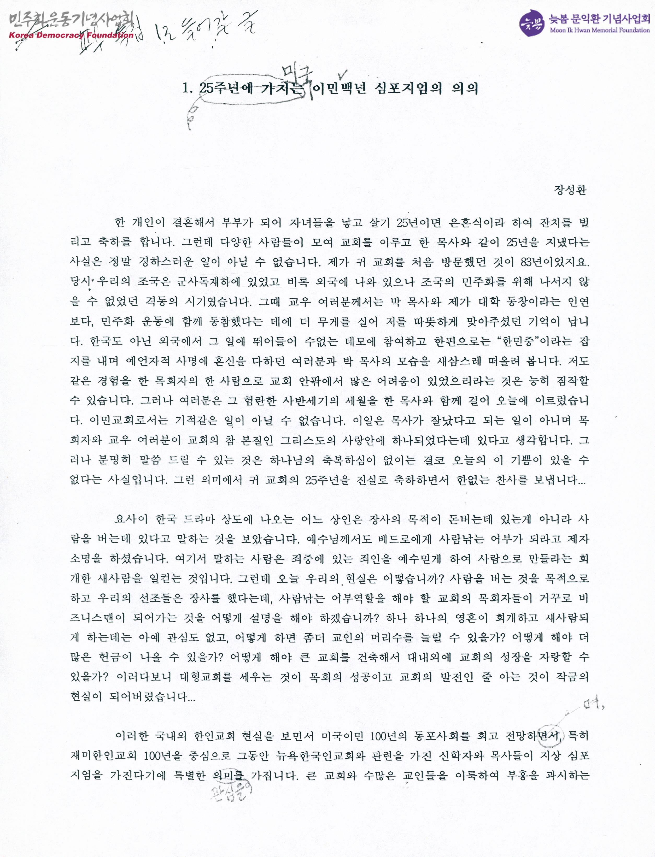 - 귀 교회의 25주년을 축하한다는 것, 대형교회를 세우는 것이 목회의 성공이고 교회의 발전인 줄 아는 현실을 보면서 미국이민 100년의 동포사회를 회고 전망하며 재미한일교회 100년을 중심으로 심포지엄을 가진다는 것은 특별한 의미를 지닌다는 것, 심포지엄이 새로운 백년의 내일이 지향할 지표를 올바르게 제시하여 교회가 크게 반성하고 새롭게 지향하는 계기가 되었으면 한다는 것 등의 내용이 적힌 문서