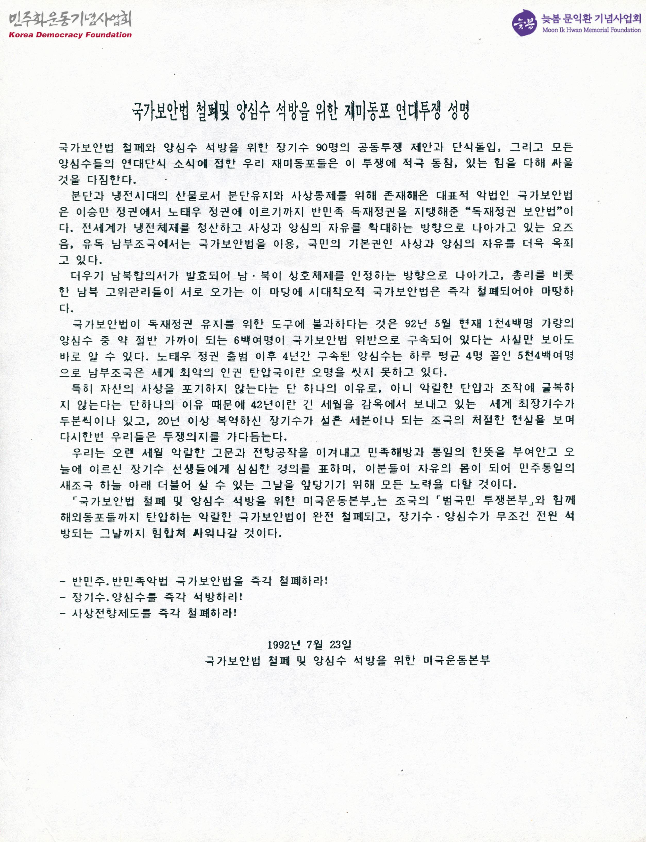 국가보안법 철폐 및 양심수 석방을 위한 재미동포 연대투쟁 성명