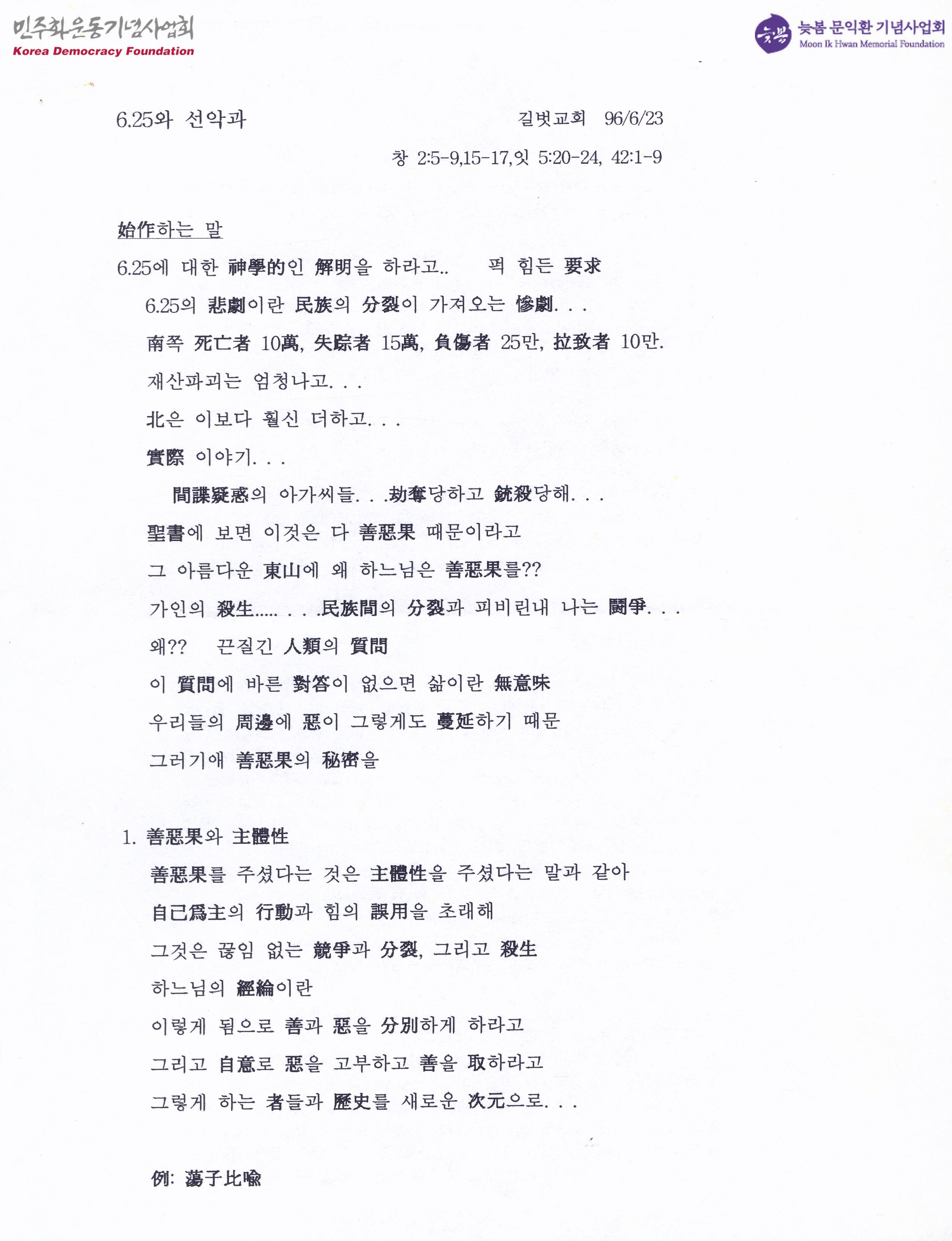 - 6.25에 대한 신학적인 해명을 하라는 힘든 요구의 내용, 6.25의 비극이란 민족의 분열이 가져오는 참극이라는 내용이 수록된 문서로 목차는 다음과 같음 1. 선악과와 주체성 2. 문제는 역사를 주무르는 강자들은 악을 행하고도 이를인정하지 않아 3. 선과 악을 바르게 보고 판단을 하는 자들이 있어