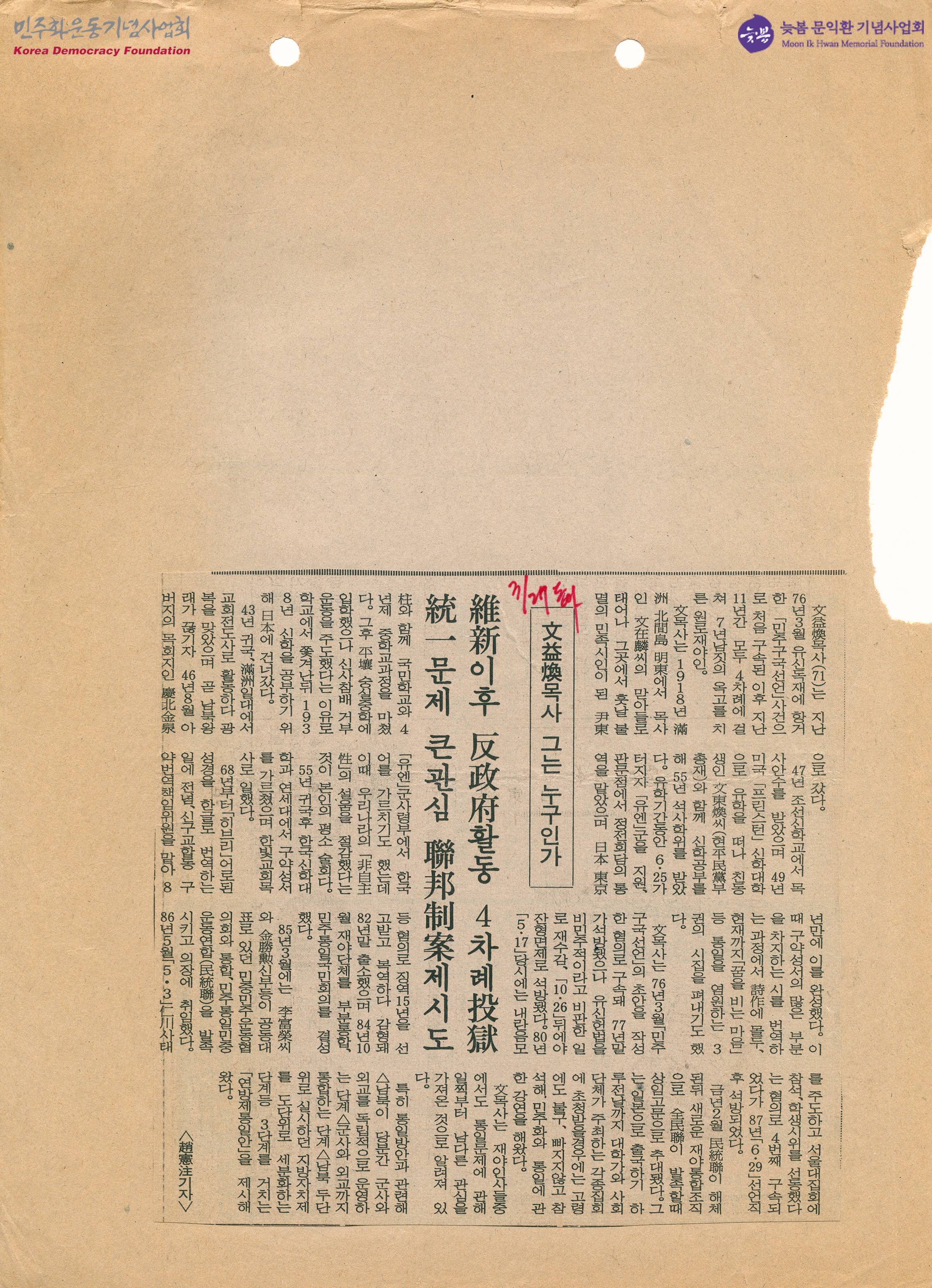 - 문익환이 만주의 북간도에서 태어난 것과 윤동주와 함께 국민학교와 중학교 교육을 마친 것, 1947년 조선신학교에서 목사 안수를 받고 49년 프린스턴 신학대학으로 유학을 가 학위를 받은 것, 「민주구국선언」의 초안을 작성해 구속된 것 등 문익환의 일대기가 간략하게 실린 신문기사의 스크랩