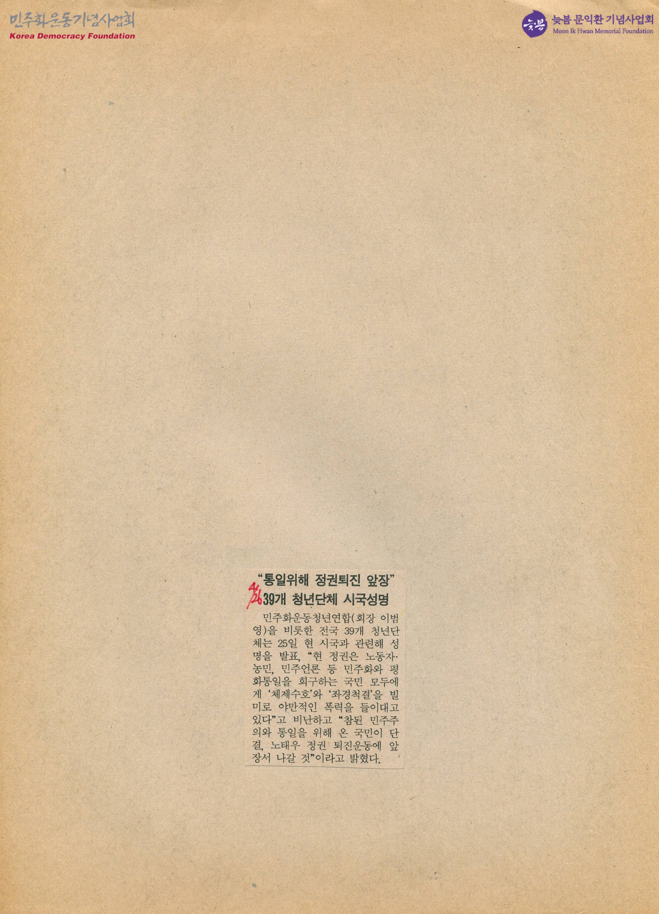 - 민주화운동청년연합을 비롯한 전국 39개 청년단체는 25일 현 시국과 관련해 성명을 발표하고, "현 정권은 노동자 농민 민주언론 등 민주화와 평화통일을 희구하는 국민 모두에게 '체제수호'와 '좌경척결'을 빌미로 야만적인 폭력을 들이대고 있다"고 비난하고 "참된 민주주의와 통일을 위해 온 국민이 단결, 노태우 정권 퇴진운동에 앞장서 나갈 것"이라고 밝혔다는 내용이 수록된 신문스크랩