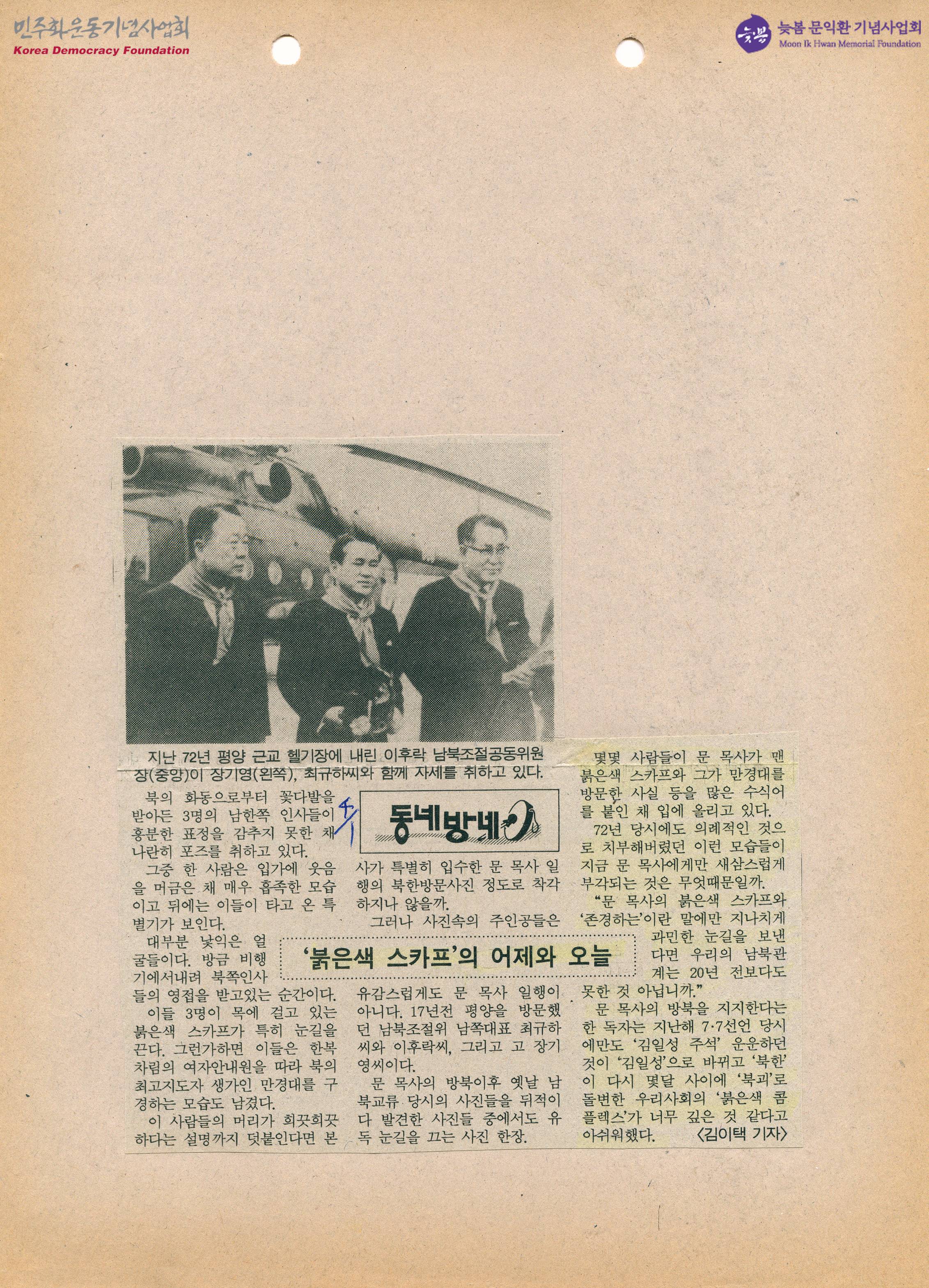 - 지난 72년 북한을 방문한 최규하, 장기영, 이후락의 사진을 보며 72년도 당시에도 의례적인 것으로 치부되던 모습들이 지금 문 목사에게만 새삼스럽게 부각되는 이유를 모르겠다는 내용의 신문스크랩