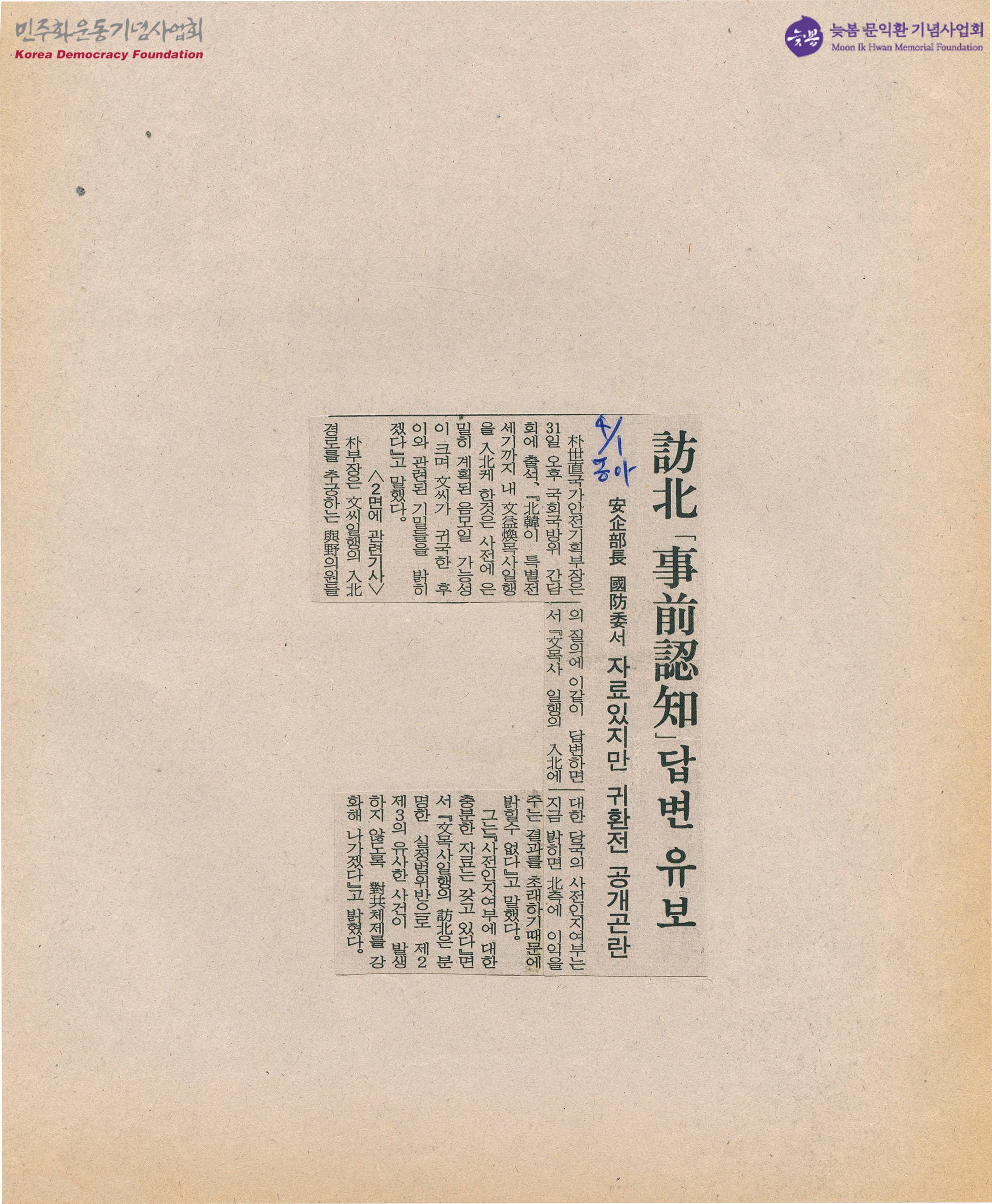- 국가안전기획부장이 국회국방위 간담회에 출석해 문 목사의 방북을 사전에 인지하고 있었는지에 대해 '지금 밝히면 북측에 이익을 주는 결과를 초래하기에 밝힐 수 없다'라는 답변을 한 내용이 수록된 신문스크랩