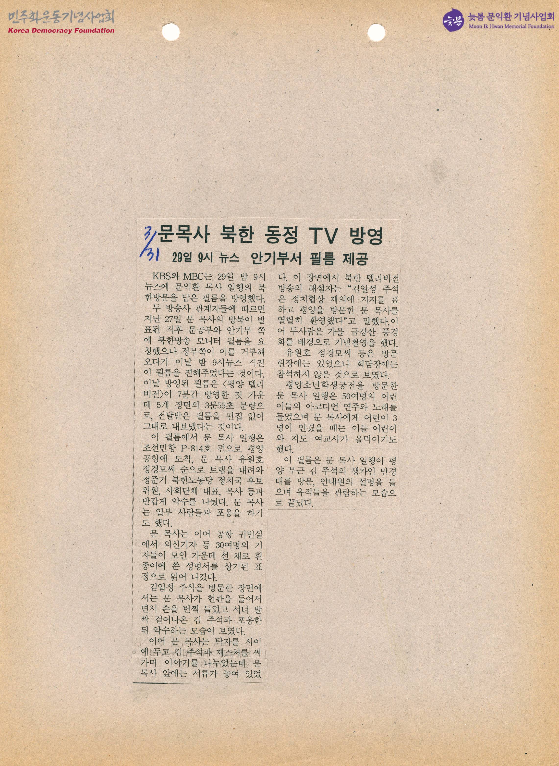- KBS와 MBC가 9시 뉴스에 문익환 목사 일행이 북한 대표들과 악수와 포옹을 나누고 성명서를 읽는 등 북한을 방문한 모습이 담긴 필름을 방영했다는 내용의 신문스크랩