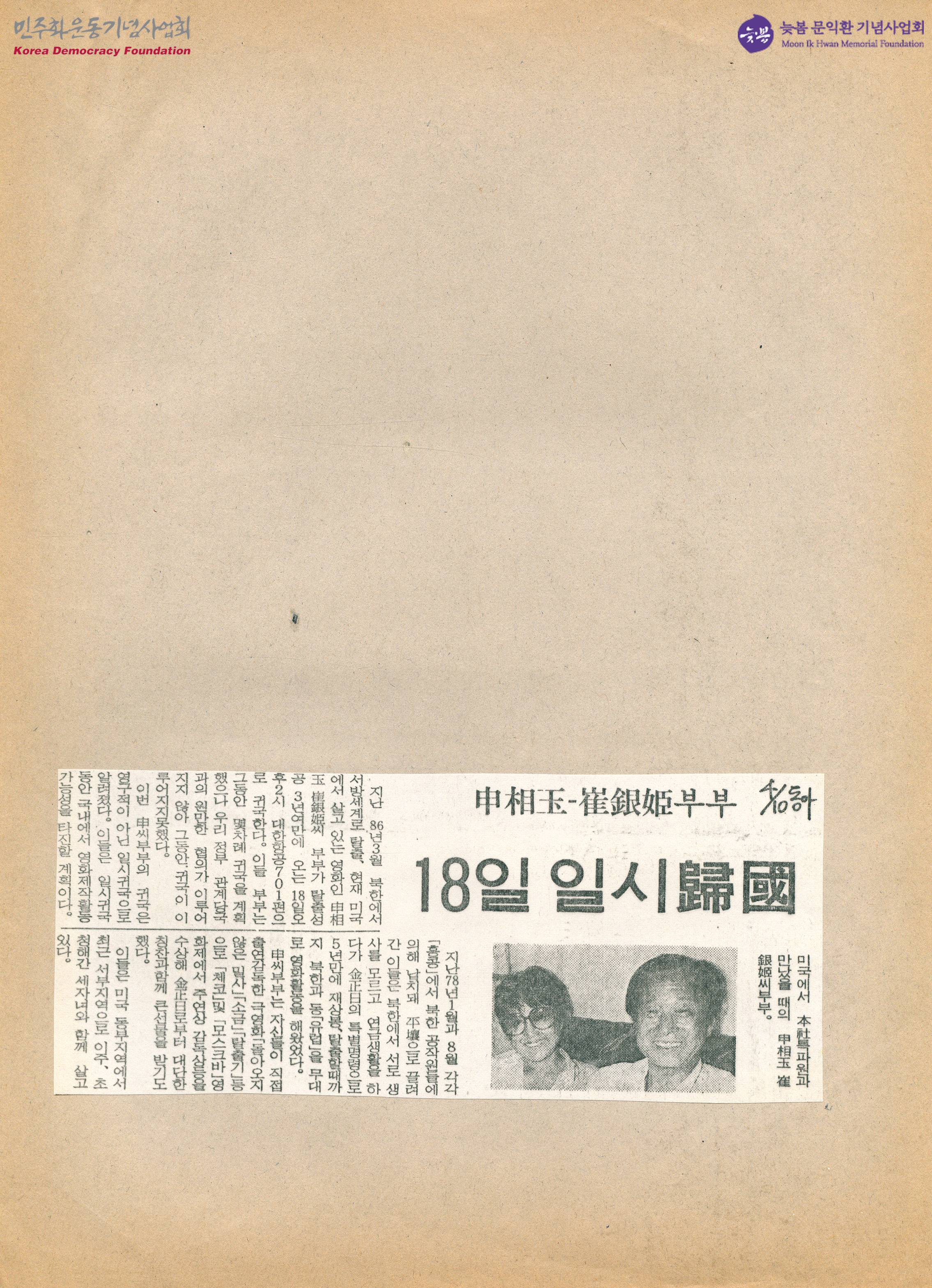 - 지난 78년 1월과 8월 홍콩에서 북한 공작원들에게 납치되어 평양으로 끌려간 후 탈출한 신상옥-최은희 부부가 탈출성공 3년여 만에 오는 18일 귀국한다는 내용이 수록된 신문스크랩