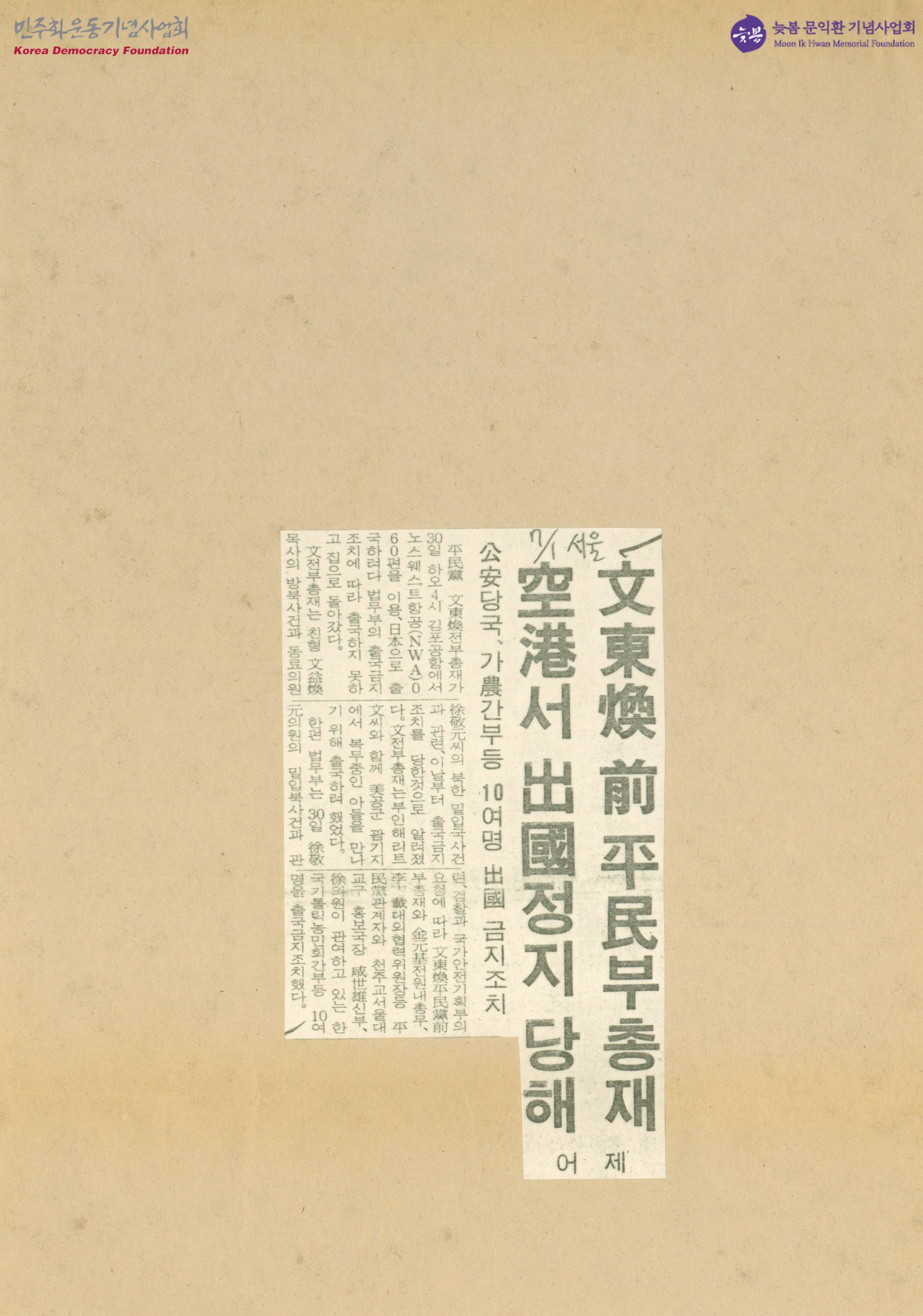 - 문동환 전 부총재는 친형 문익환 목사의 방북사건과 동료의원 서경원씨의 북한 밀입국사건과 관련, 이날부터 출국금지 조치를 당하였다는 내용이 수록된 신문스크랩