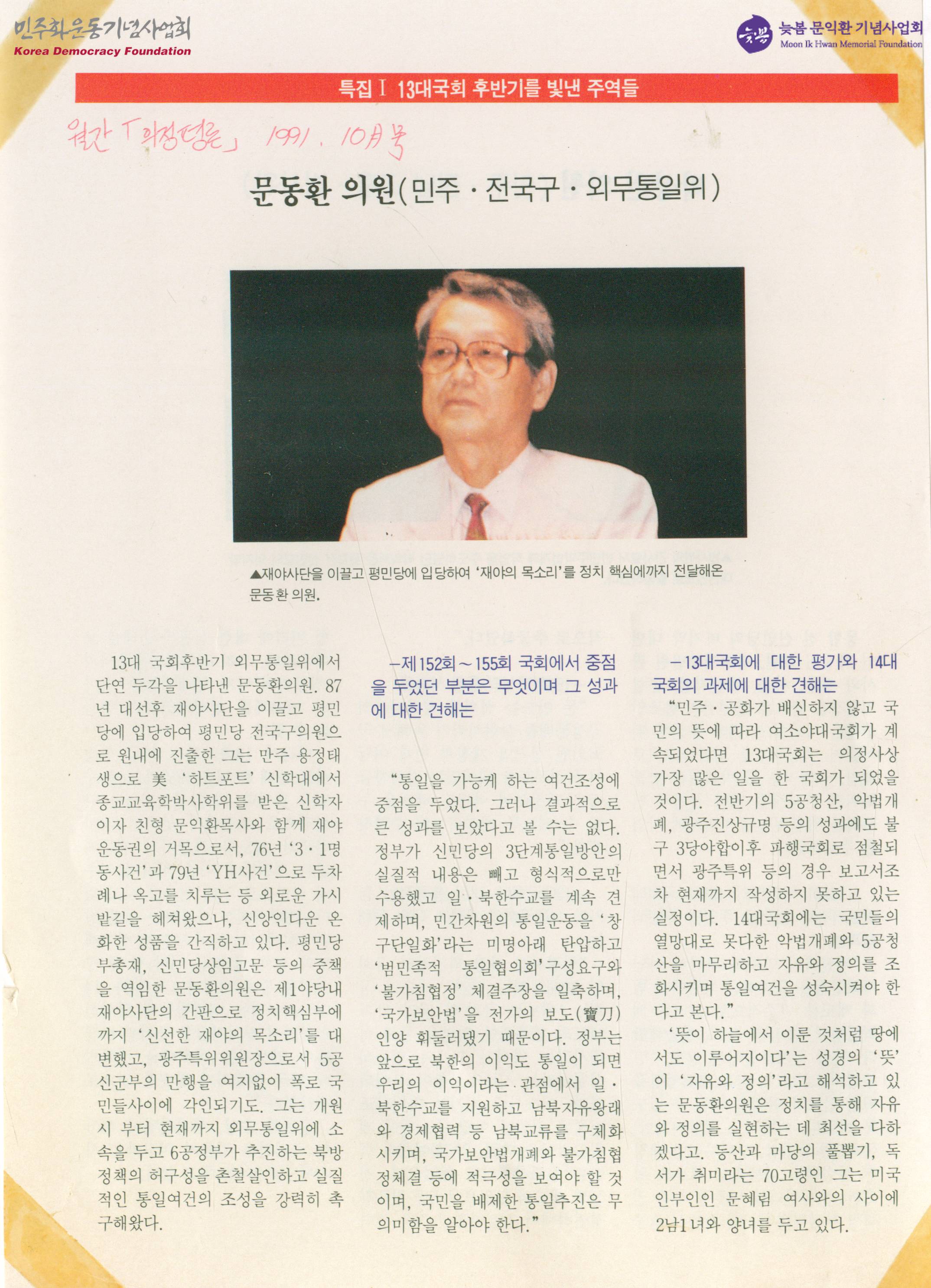 - 전반기의 5공청산, 악법개폐, 광주진상규명 등의 성과에도 불구 3당야합이후 파행국회로 점철되면서 광주특위 등의 경우 보고서조차 현재까지 작성하지 못하고 있는 실정이며, 14대 국회에는 국민들의 열망대로 못다한 악법개폐와 5공청산을 마무리하고 자유와 정의를 조화시키며 통일여건을 성숙시켜야 한다고 생각한다는 내용이 수록된 신문스크랩