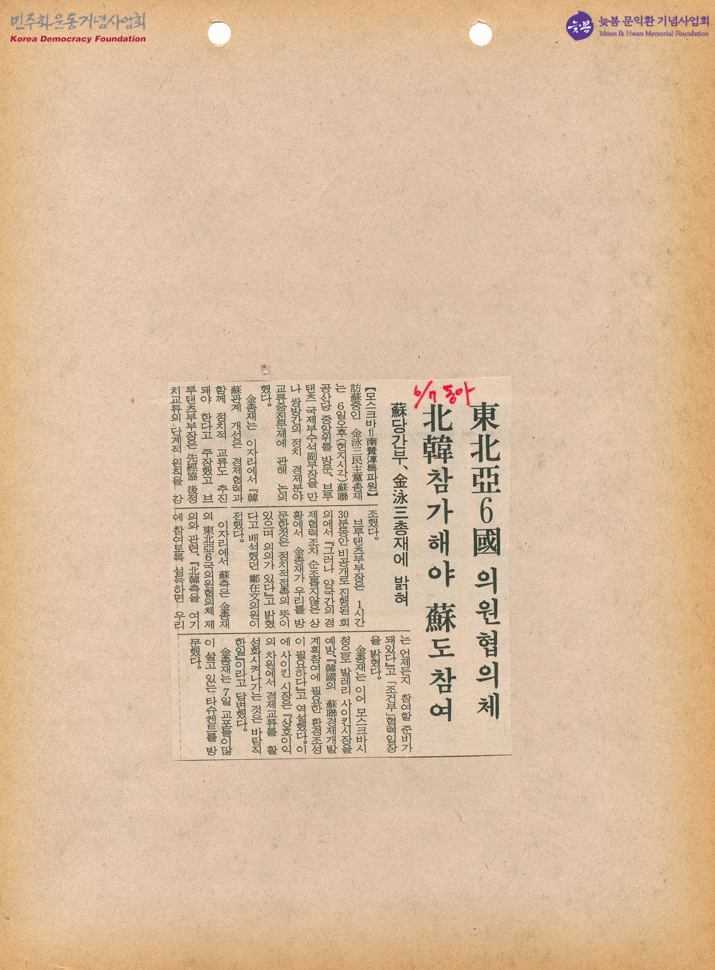 - 김영삼 민주당 총재는 소련 공산당 중앙위를 방문, 브루탠츠 국제부수서부부장을 만나 쌍방간의 정치 경제분야 교류증진문제에 관해 논의 하였으며. 소련측은 김총재의 동북아6국의원협의체 제의와 관련하여 북한측을 여기에 참여토록 설득하면 우리는 언제든지 참여할 준비가 되어있다며 조건부 협력입장을 밝혔다는 내용이 수록된 신문스크랩