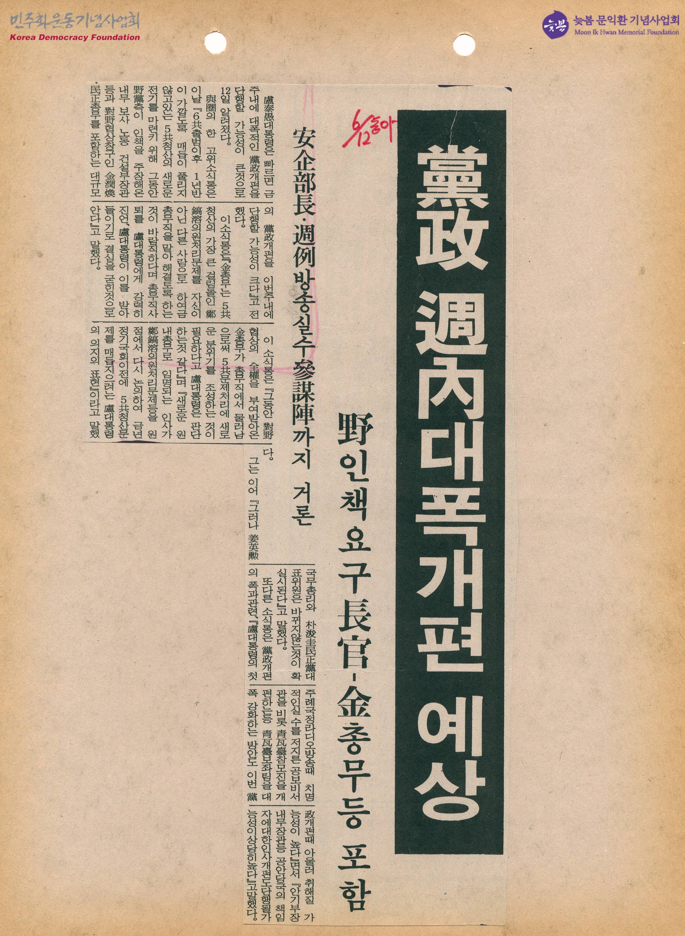 - 당정개편과 관련하여 "노태우 대통령의 첫 주례 국정라디오 방송때 치명적인 실수를 저지른 공보비서관을 비롯, 청와대 참모진을 개편하는 등 청와대 보좌팀을 대폭 강화하는 방안도 이번 당정 개편때 아울러 행해질 가능성이 높다"며 "안기부장 등 공안당국의 핵임자에 대한 인사개편도 단행될 가능성이 높다"고 알려졌다는 내용이 수록된 신문스크랩