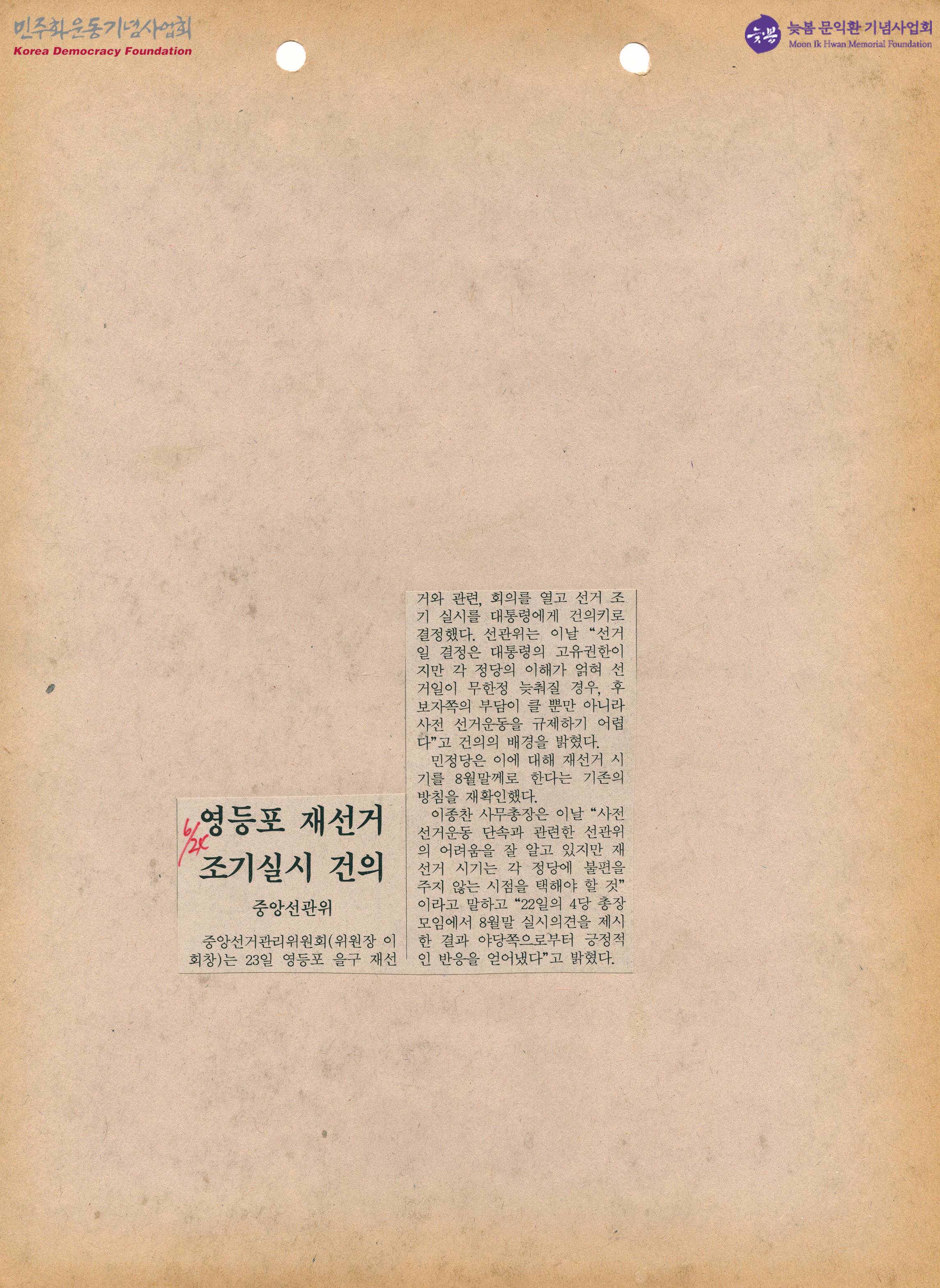 - 중앙선거관리위원회는 영등포 을구 재선거와 관련하여 회의를 열거 선거 조기 실시를 대통령에게 건의하기로 결정하였으며, 선관위는 "선거일 결정은 대통령의 고유권한이지만 각 정당의 이해가 얽혀 선거일이 무한정 늦춰질 경우, 후보자 쪽의 부담이 클 뿐만 아니라 사전 선거운동을 규제하기 어렵다"고 건의의 배경을 밝혔다는 내용이 수록된 신문스크랩