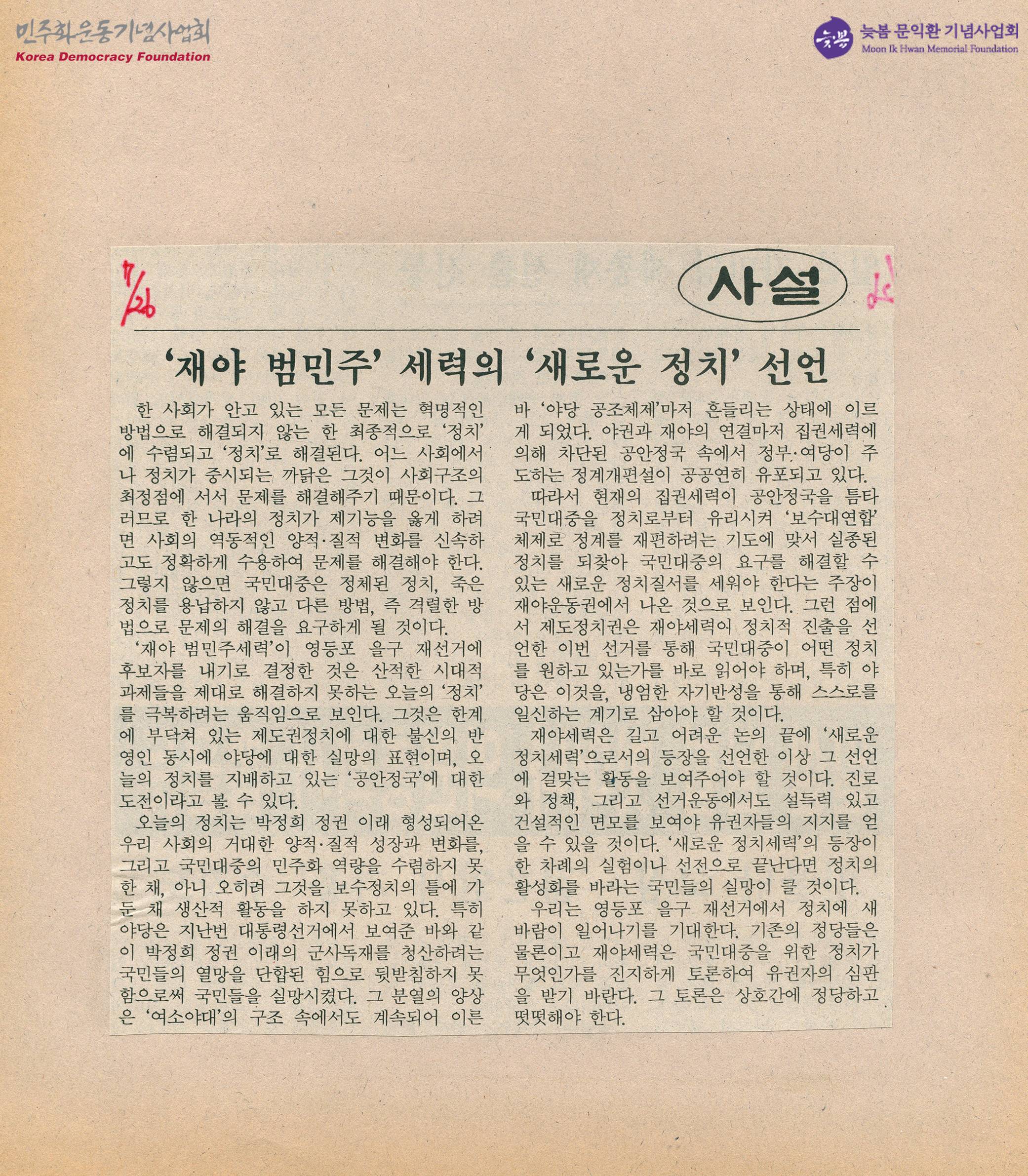 [신문스크랩]'재야 범민주' 세력의 '새로운 정치' 선언