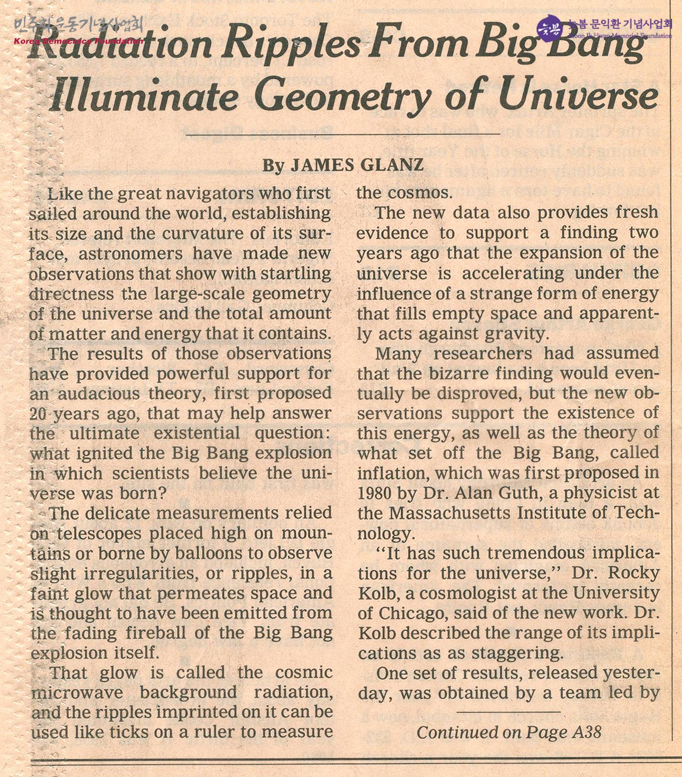 - 우주배경복사 관련 연구의 결과에 대한 글로 천문학자들이 연구 결과를 토대로 우주에 암흑물질과는 구별되는 알려지지 않은 에너지가 있을 것이라는 결론을 내렸다는 내용 등이 실린 신문스크랩