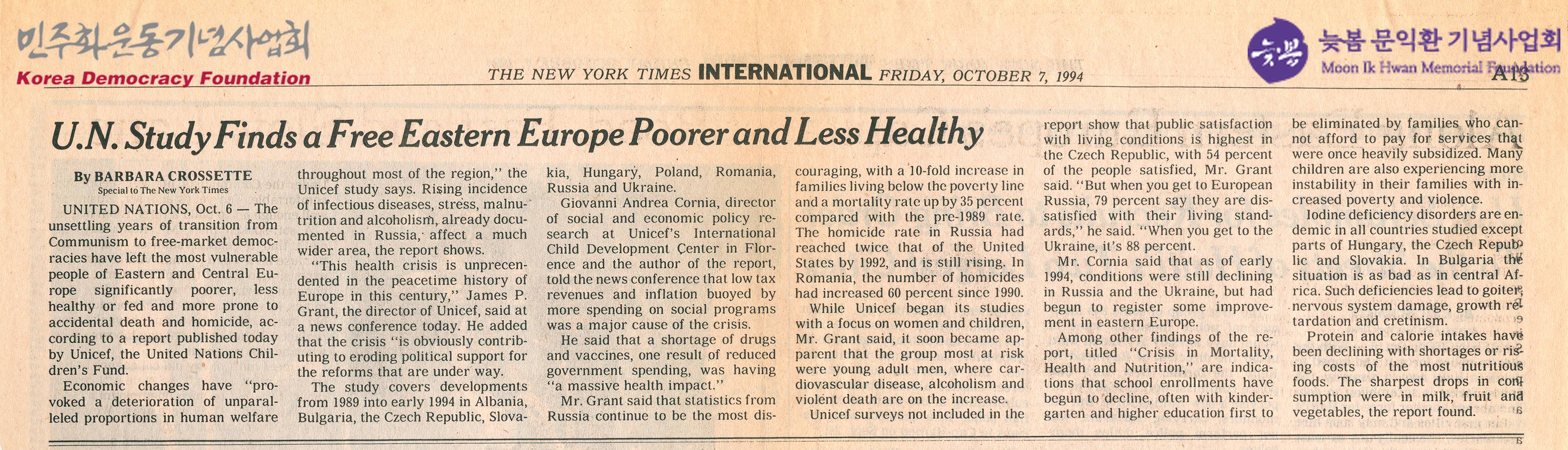 - 유니세프에서 발표한 보고서를 인용해 동유럽 국가들이 공산주의에서 자유시장 민주주의로 전환하는 과정에서 국민들의 생활 수준과 건강 상태가 크게 악화되었음을 밝히는 내용의 신문스크랩