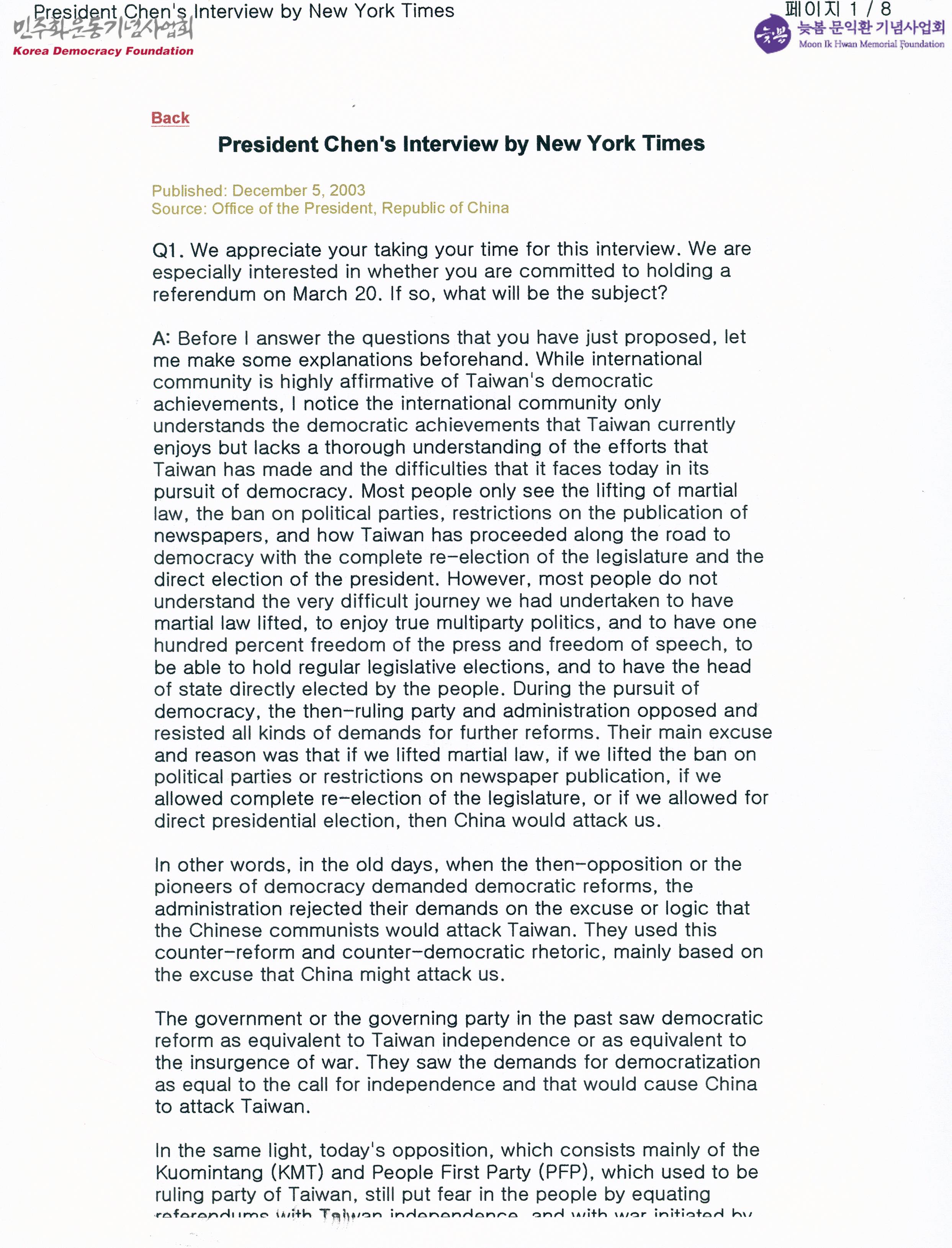 - 뉴욕타임즈의 대만 천수이볜 총통 인터뷰 내용으로, 3월 20일 국민투표를 실시할 계획이 있는지, 우리는 1996년 이후 양안 관계의 가장 긴장된 시기에 있는 것인지, 만약 그렇다면 총통의 행동이 미국과 다른 외국 국가들을 불쾌하게 할 수 있는 방식으로 긴장을 증가시킬 것이라고 생각하는지 등의 질문에 대한 답변이 수록된 문서