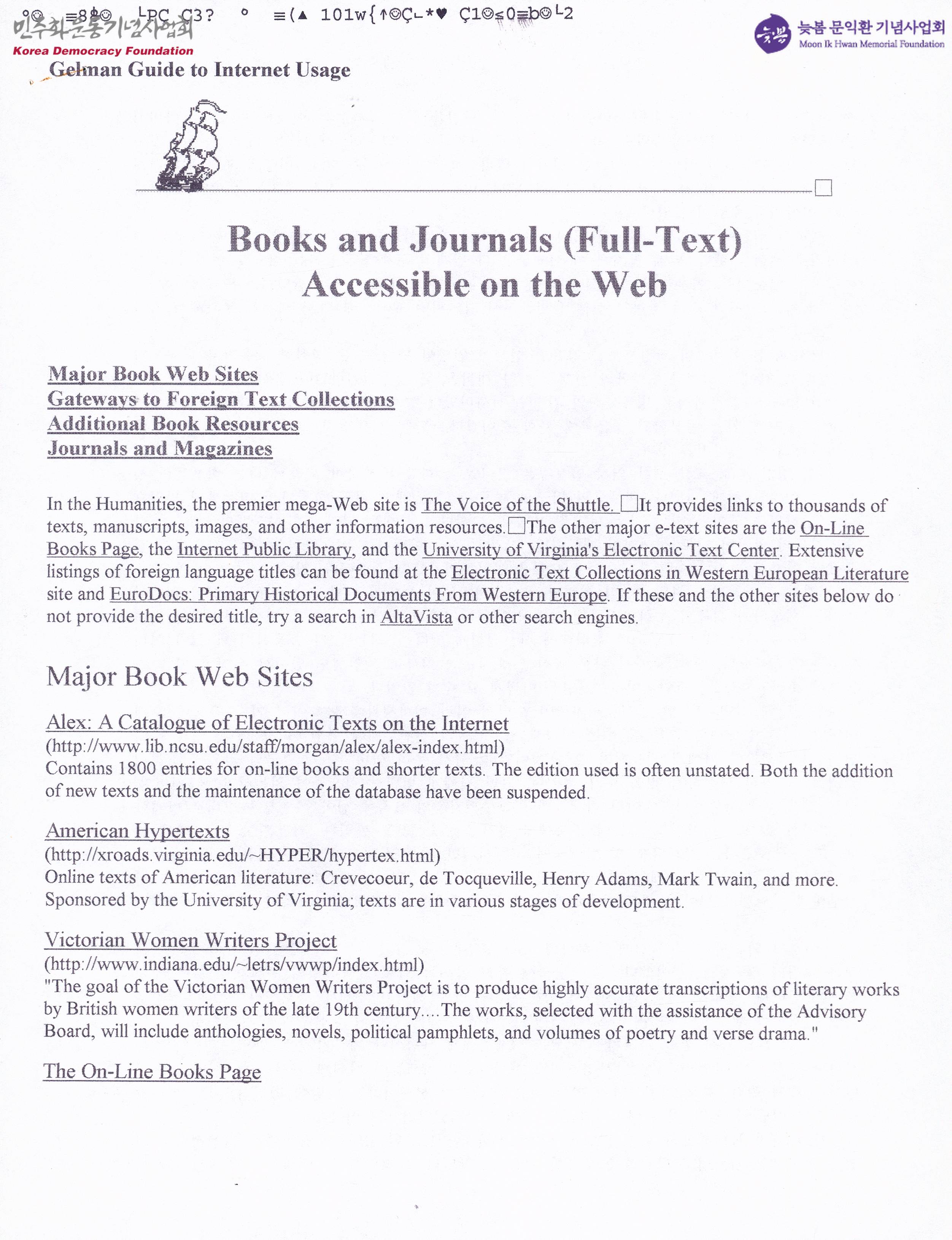- 인문학 분야에서 도서 관련 최고의 웹 사이트는 '더 보이스 오브 더 셔틀'이며 이 사이트에서는 수천 개의 텍스트, 원고, 이미지 및 기타 정보 등에 대한 링크를 제공한다는 내용, 다양한 언어로 된 컬렉션에 대한 링크를 제공하며, 개별 텍스트 뿐만 아니라 중세 혼인, 개신교 종교 개혁, 세계대전, 국제 조약 등 특정 주제에 대한 링크를 제공한다는 내용 등이 수록된 문서