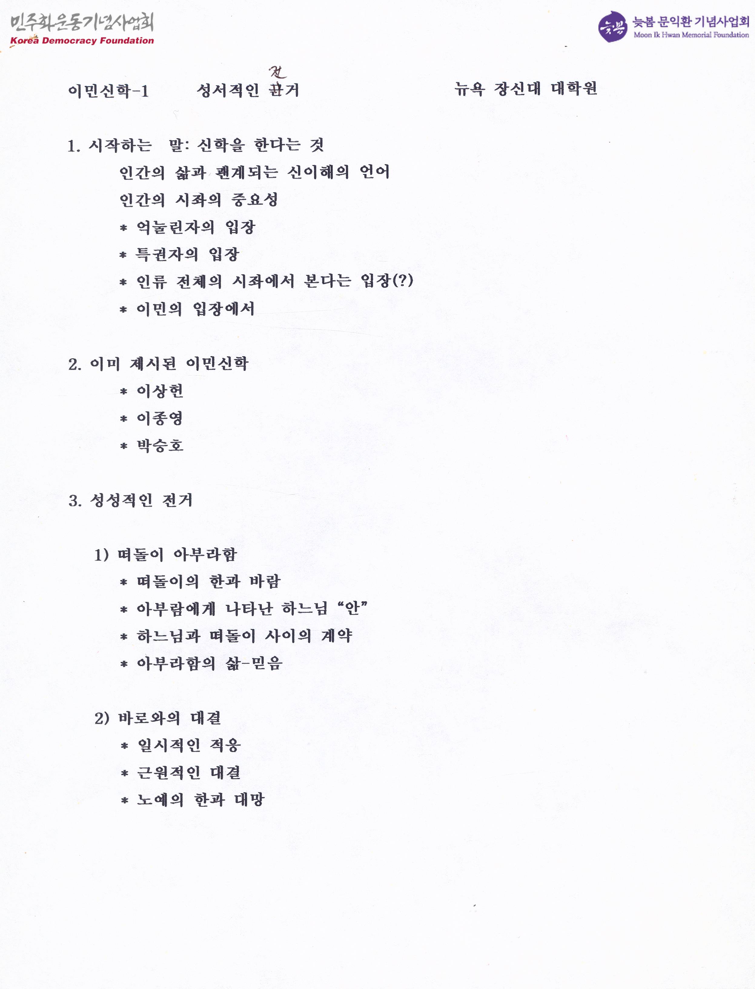 - 신학을 공부한다는 것, 이미 제시된 이민신학의 예, 이민신학의 성서적인 전거 등을 제시한 내용이 수록된 문서
