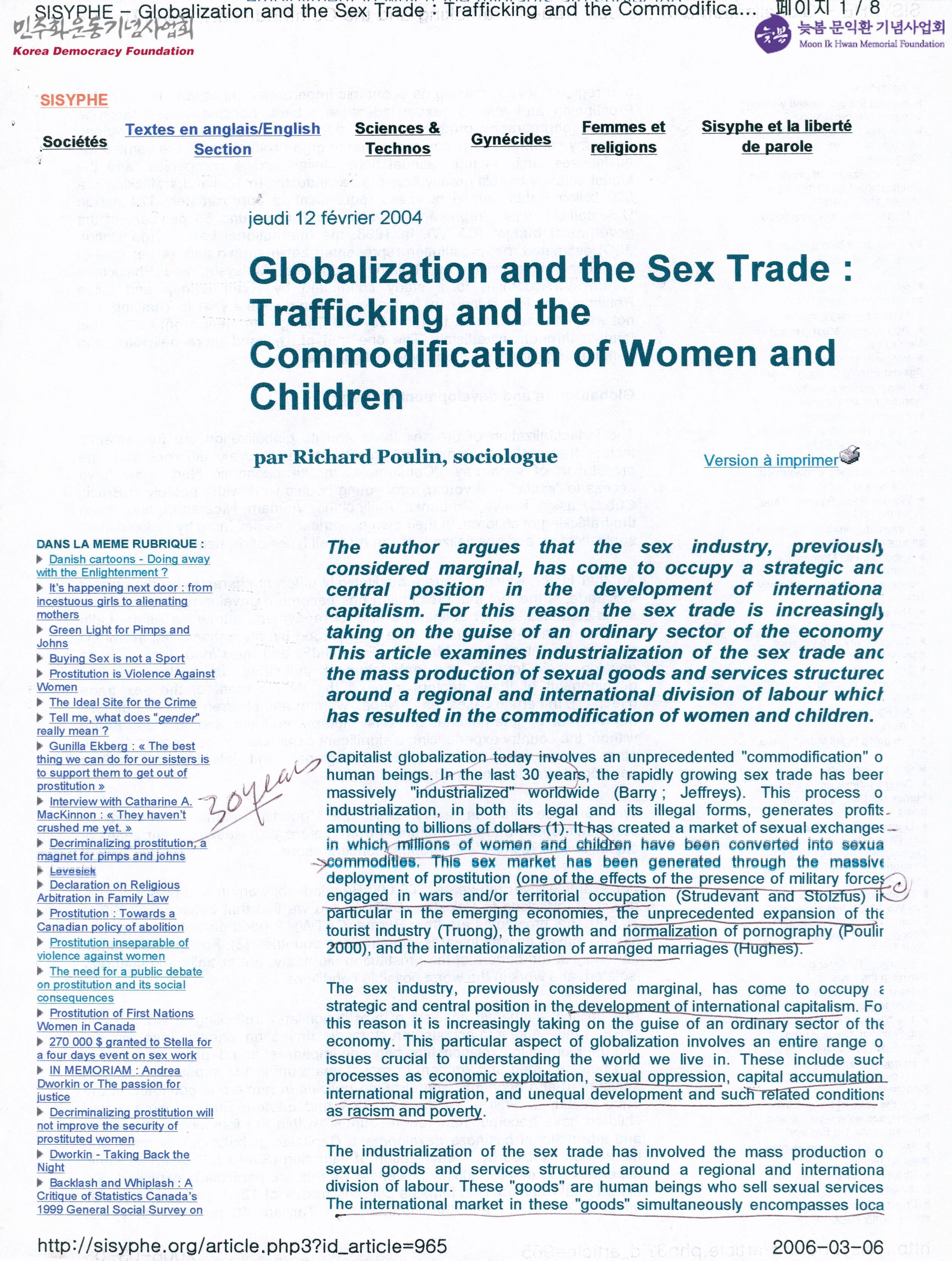 - 오늘날 자본주의적 세계화는 전례 없는 '상품화'를 수반하며, 이로 인해 성산업이 국제 자본주의 발전에서 전략적이고 중심적인 위치를 차지하게 되었다는 내용이 수록된 문서로 주요 내용은 다음과 같음 -Globalization and development strategy(세계화와 발전 전략) -Prostitution and Trafficking(성매매 및 인신매매) -The Liberalization of the Sex Industry(성산업의 자유화) -Conclusion(결론)