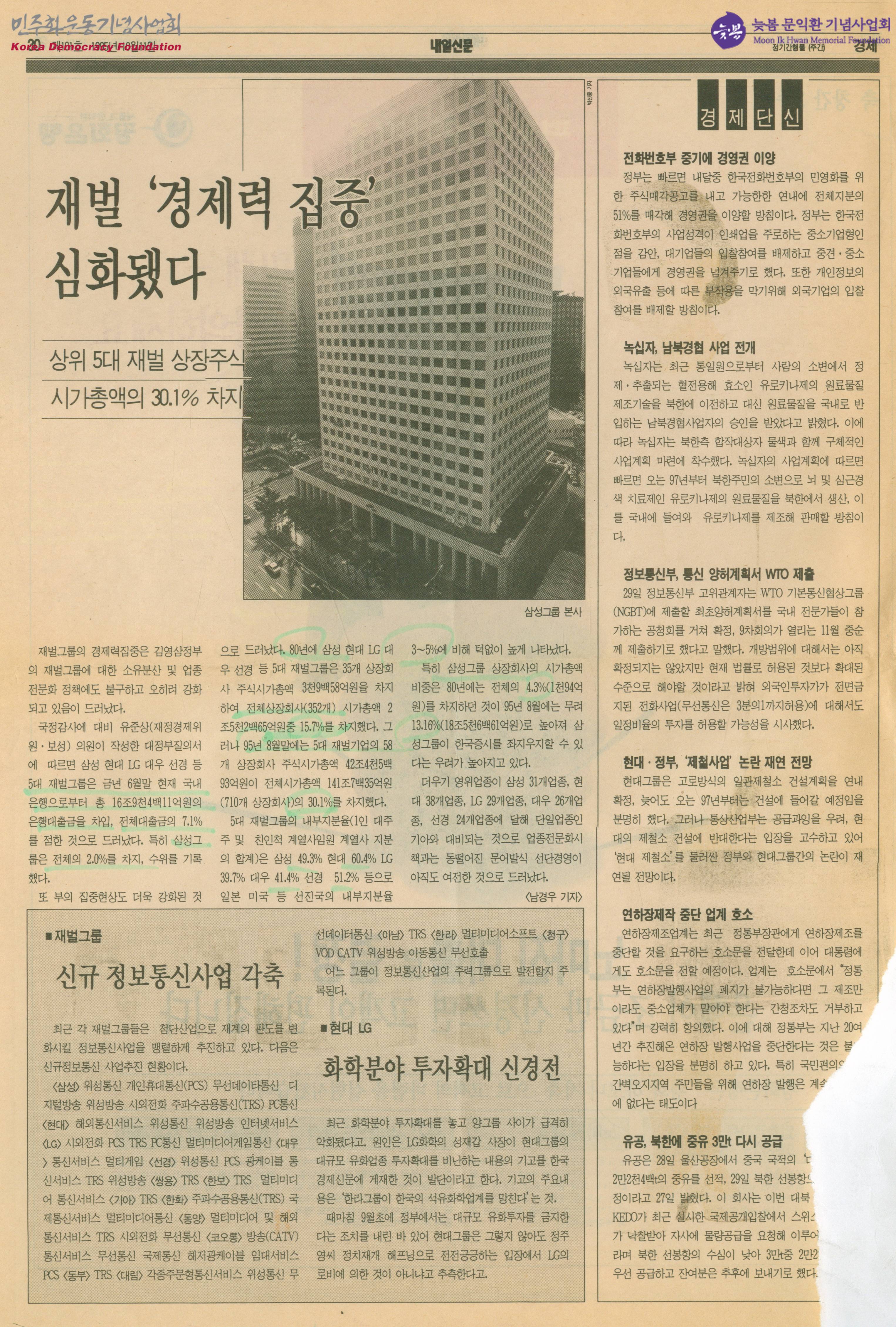- 재벌그룹의 상장주식이 시가총액의 30%를 차지했다는 글, 녹십자에서 북한과의 경제협력 사업을 전개할 방침이라는 글, 유공이 북한에 중유 3만톤을 다시 공급할 예정이라는 글 등이 수록된 신문스크랩
