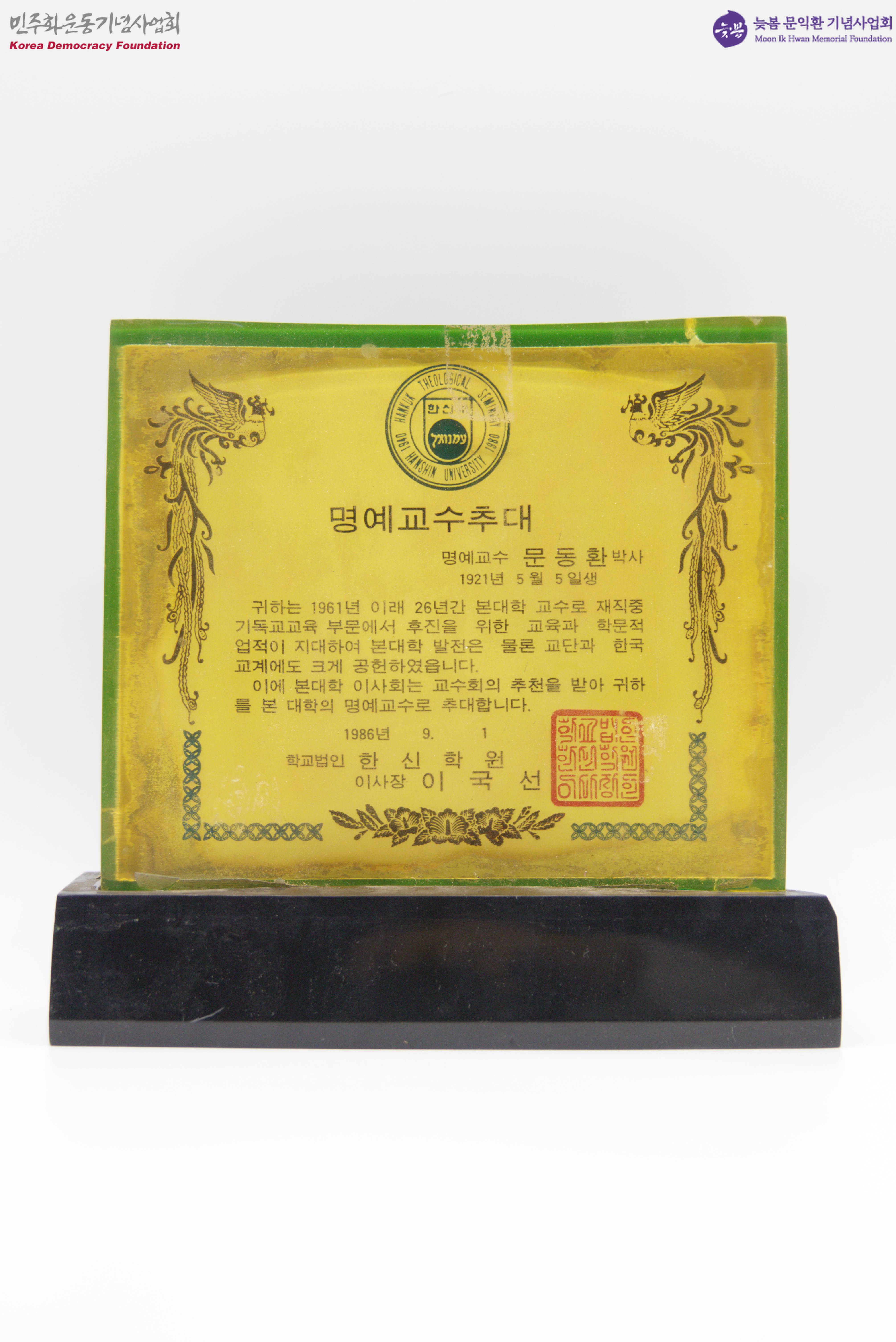 - 신학교육 부문에서 후진 양성 및 학문적 업적을 인정받아 명예교수로 추대한다는 내용이 담긴 기념패