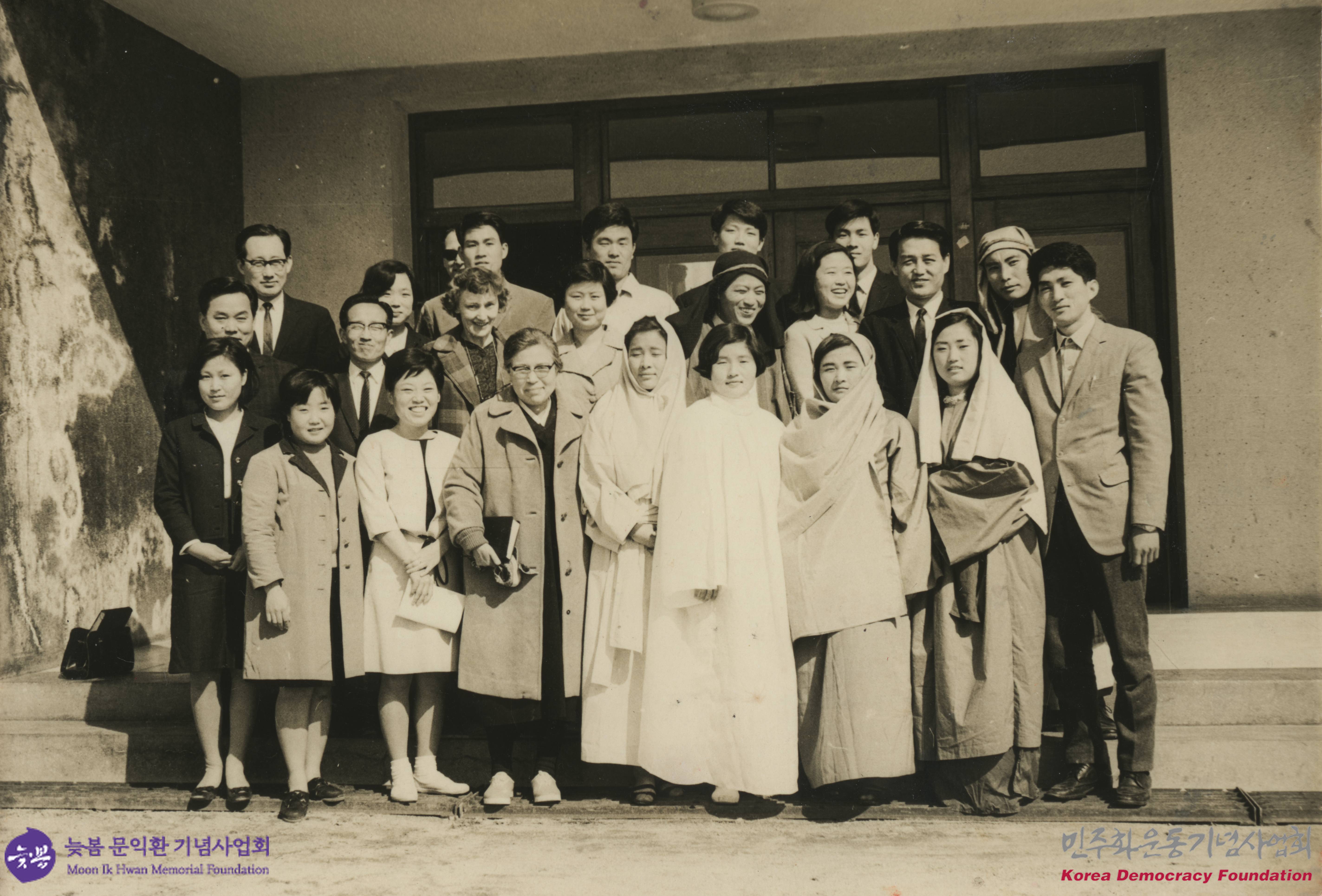 - 한신대학교 입구에서 연극이 끝난 후 연기자들과 문동환 부부, 문익환 등이 함께 촬영한 단체사진