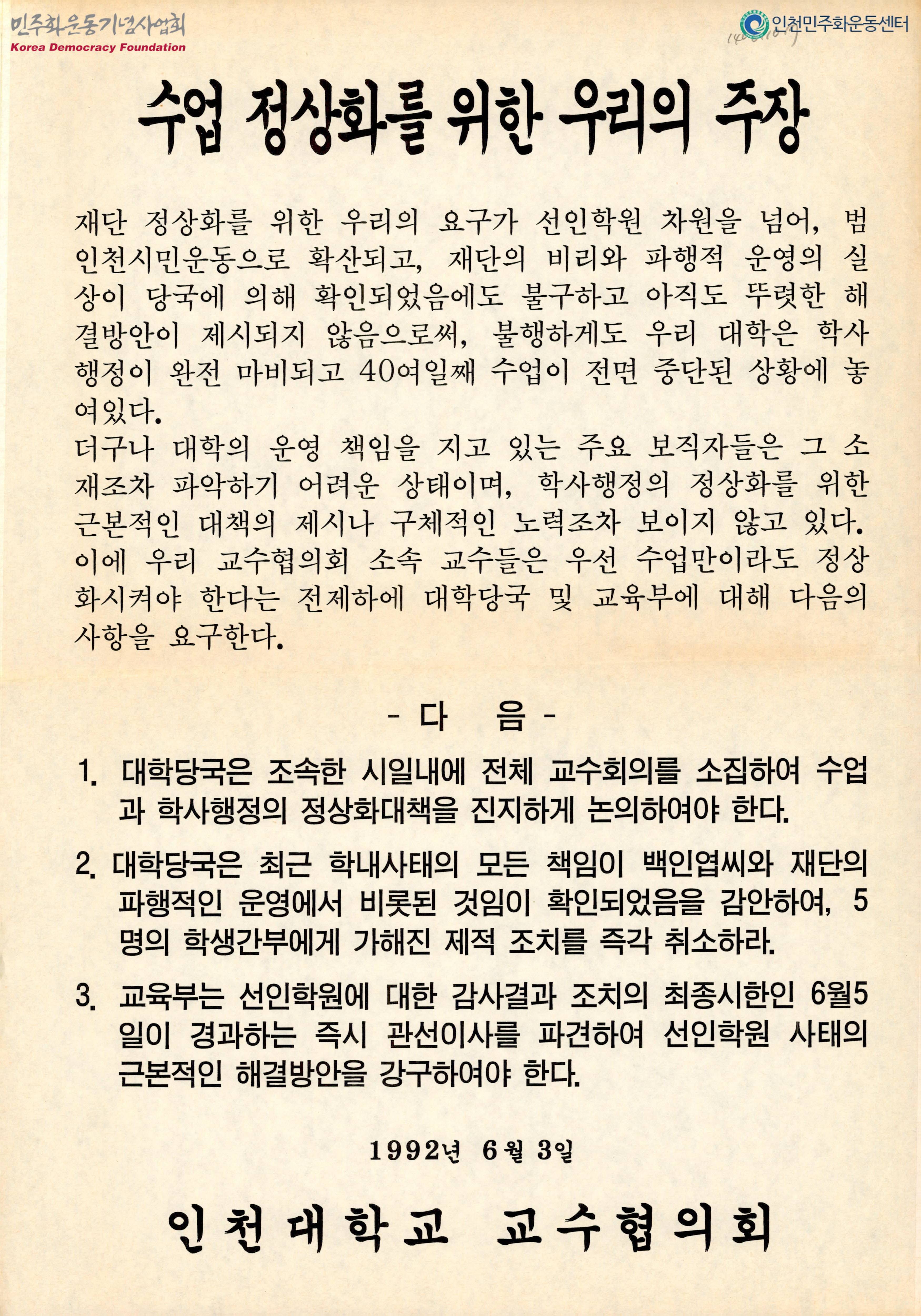 - 대학의 운영 책임을 지고 있는 주요 보직자들은 그 소재조차 파악하기 어려운 상태이며, 학사행정의 정상화를 위한 근본적인 대책의 제시나 구체적인 노력조차 보이지 않고 있으며, 이에 교수협의회 소속 교수들은 우선 수업만이라도 정상화시켜야 한다는 전제하에 대학당국 및 교육부에 대해 다음의 사항을 요구한다는 내용이 수록된 문서로 요구사항은 다음과 같음 1. 대학당국은 조속한 시일내에 전체 교수회의를 소집하여 수업과 학사행정의 정상화대책을 진지하게 논의하여야 한다 2. 대학당국은 최근 학내사태의 모든 책임이 백인엽씨와 재단의 파행적인 운영에서 비롯된 것임이 확인되었음을 감안하여, 5명의 학생간부에게 가해진 제적 조치를 즉각 취소하라 3. 교육부는 선인학원에 대한 감사결과 조치의 최종시한인 6월5일이 경과하는 즉시 관선이사를 파견하여 선인학원 사태의 근본적인 해결방안을 강구하여야 한다