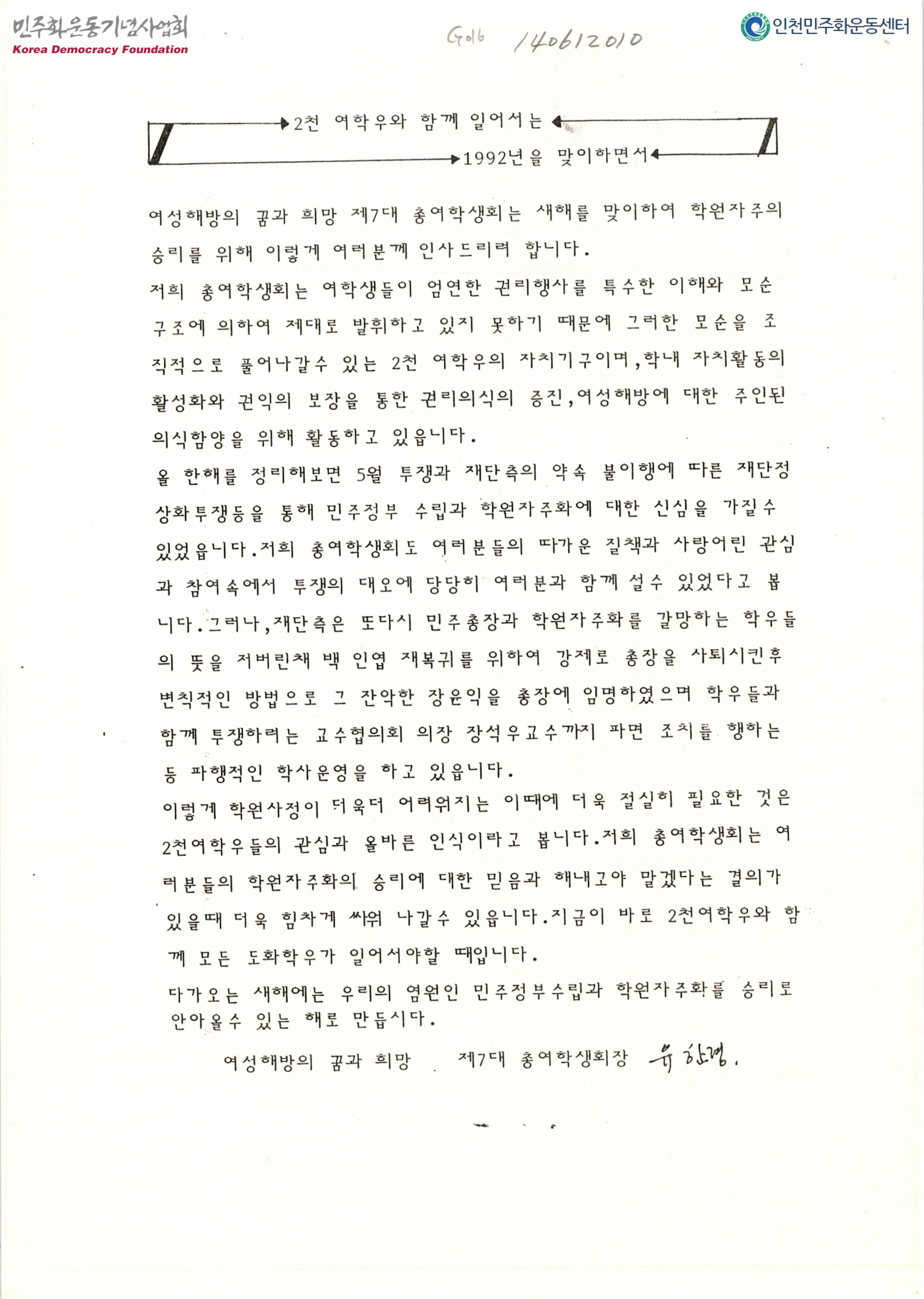 2천 여학우와 함께 일어서는 1992년을 맞이하면서