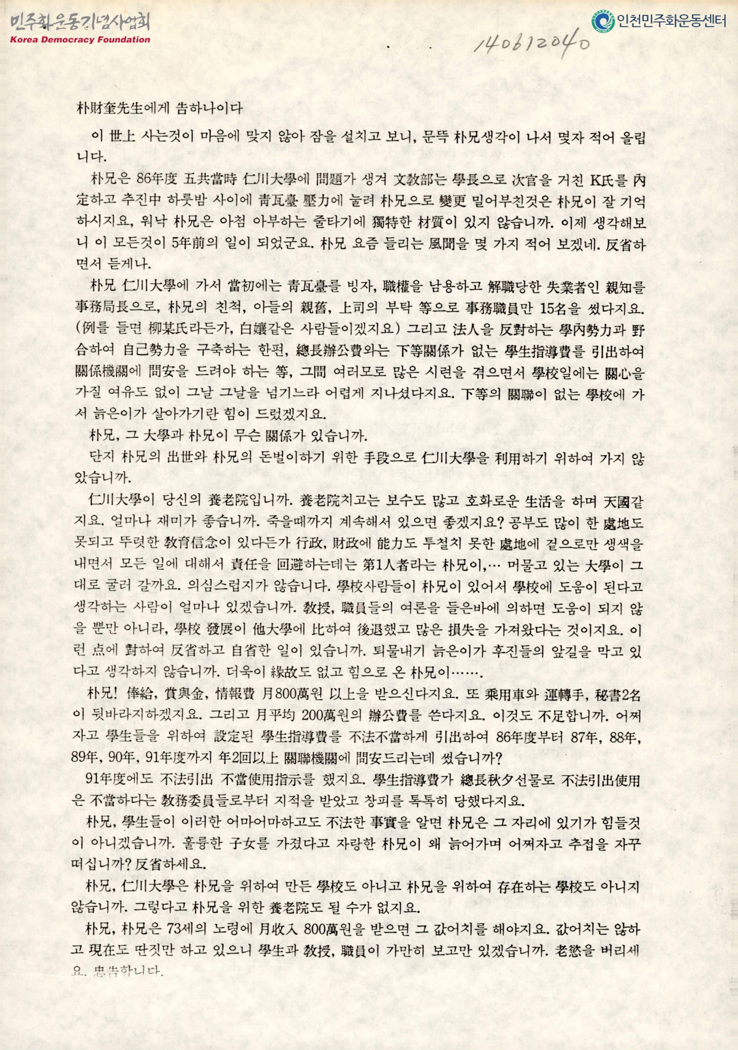 - 5공시절 선인학원에 문제가 생겨 문교부가 학장으로 차관을 거친 K씨를 내정하고 추진했을 때 청와대 압력에 눌려 박형으로 밀어부쳤으며, 아첨, 아부하는 줄타기에 독특한 재질이 있는 박형을 비판하며 선인학원을 위해 한시 빨리 학원을 떠나라는 내용 등이 수록된 문서