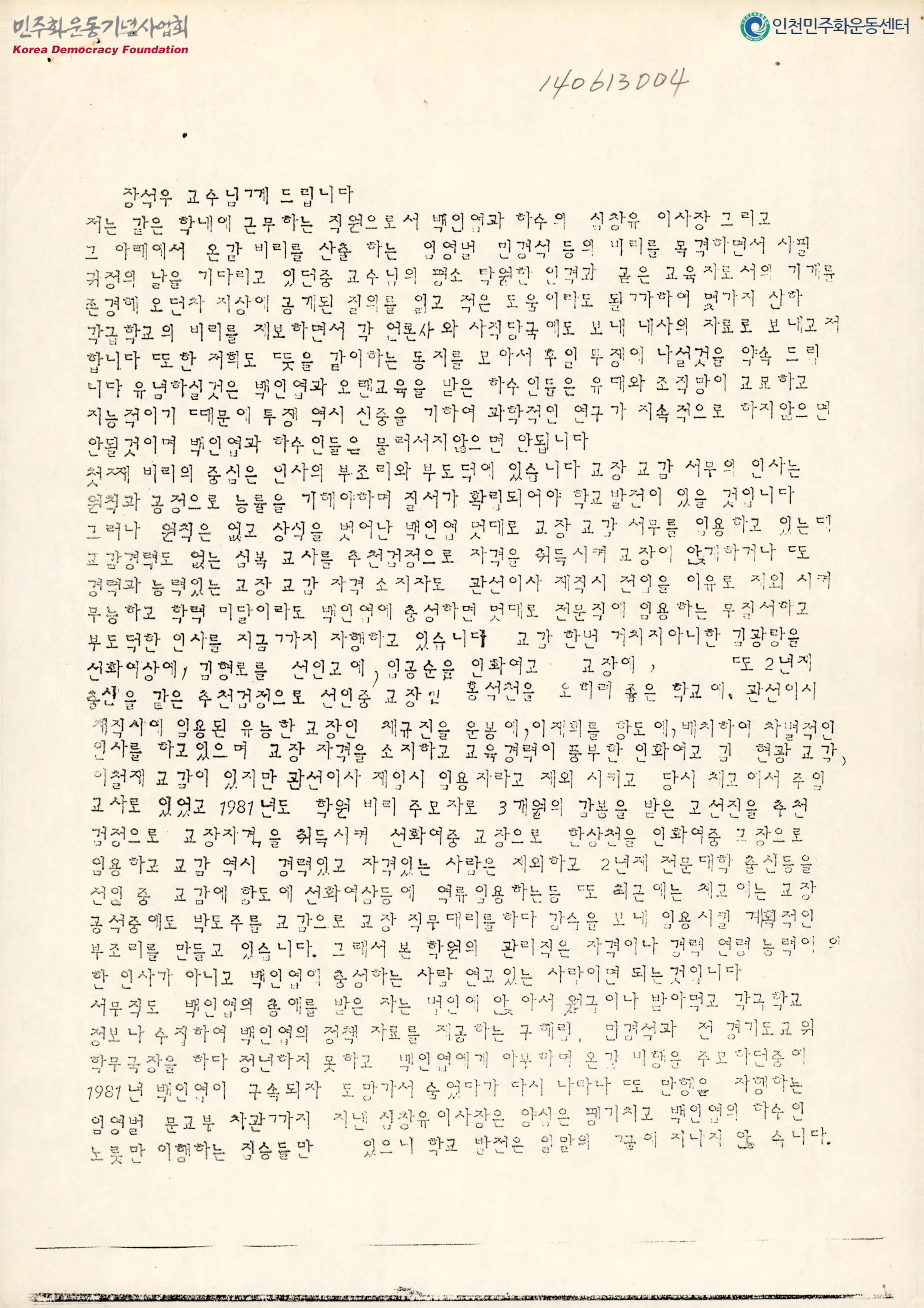 - 선인학원 비리의 중심은 인사의 부조리와 부도덕에 있으며, 학사문제에도 지나치게 간섭하여 교장으로 하여금 학교 현황을 작성하여 신촌 백인엽 댁에까지 가서 브리핑을 해야하며, 예산절약을 내세워 시대에 뒤떨어진 간섭을 강요하고 있다는 내용으로 많은 일반 교사 직원들이 백인엽이 선인학원에 영원히 들어오지 못하게 막기위해 찬성하며 백인엽의 관여에 반대하는 분위기라는 내용 등이 수록된 문서