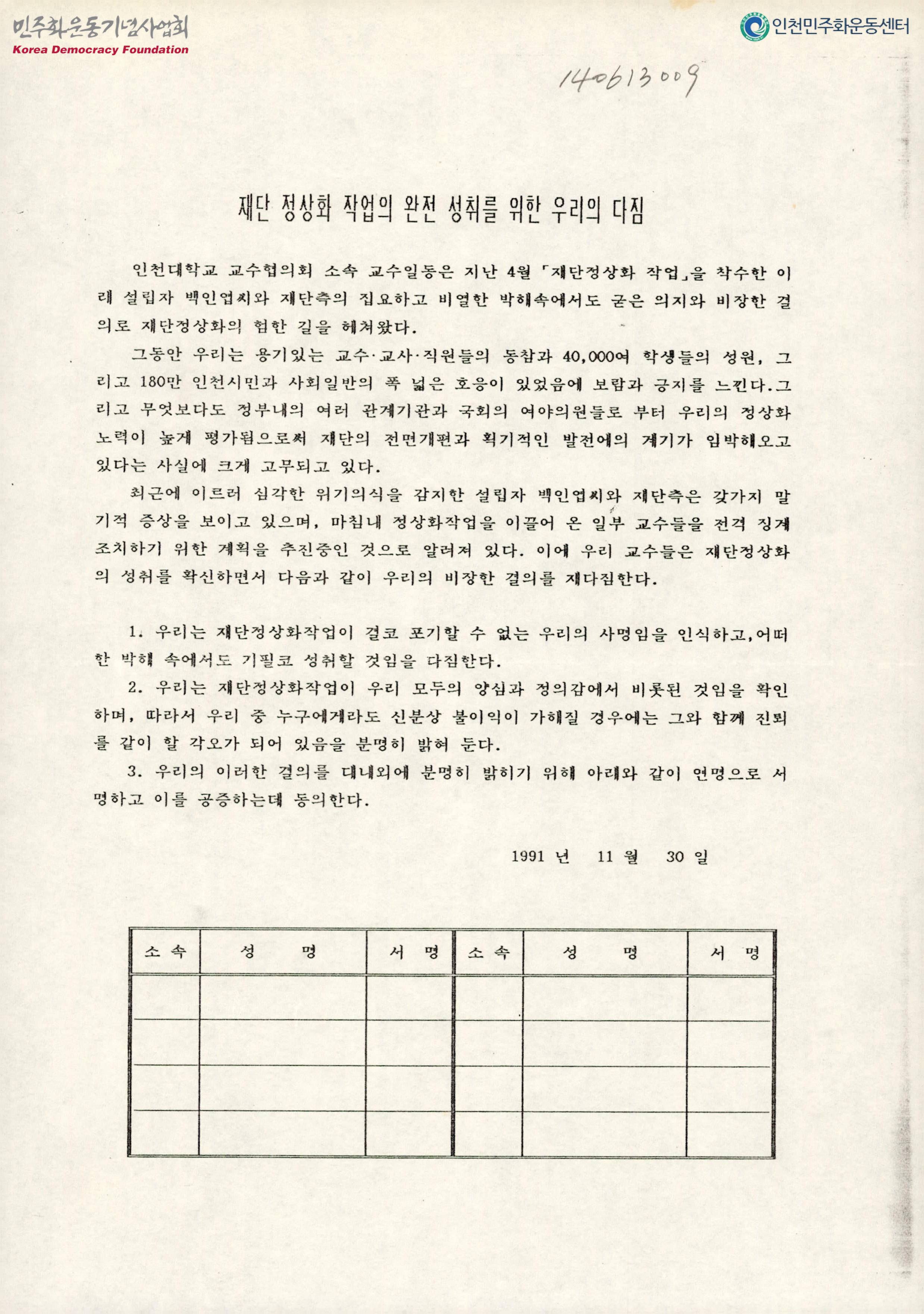재단 정상화 작업의 완전 성취를 위한 우리의 다짐