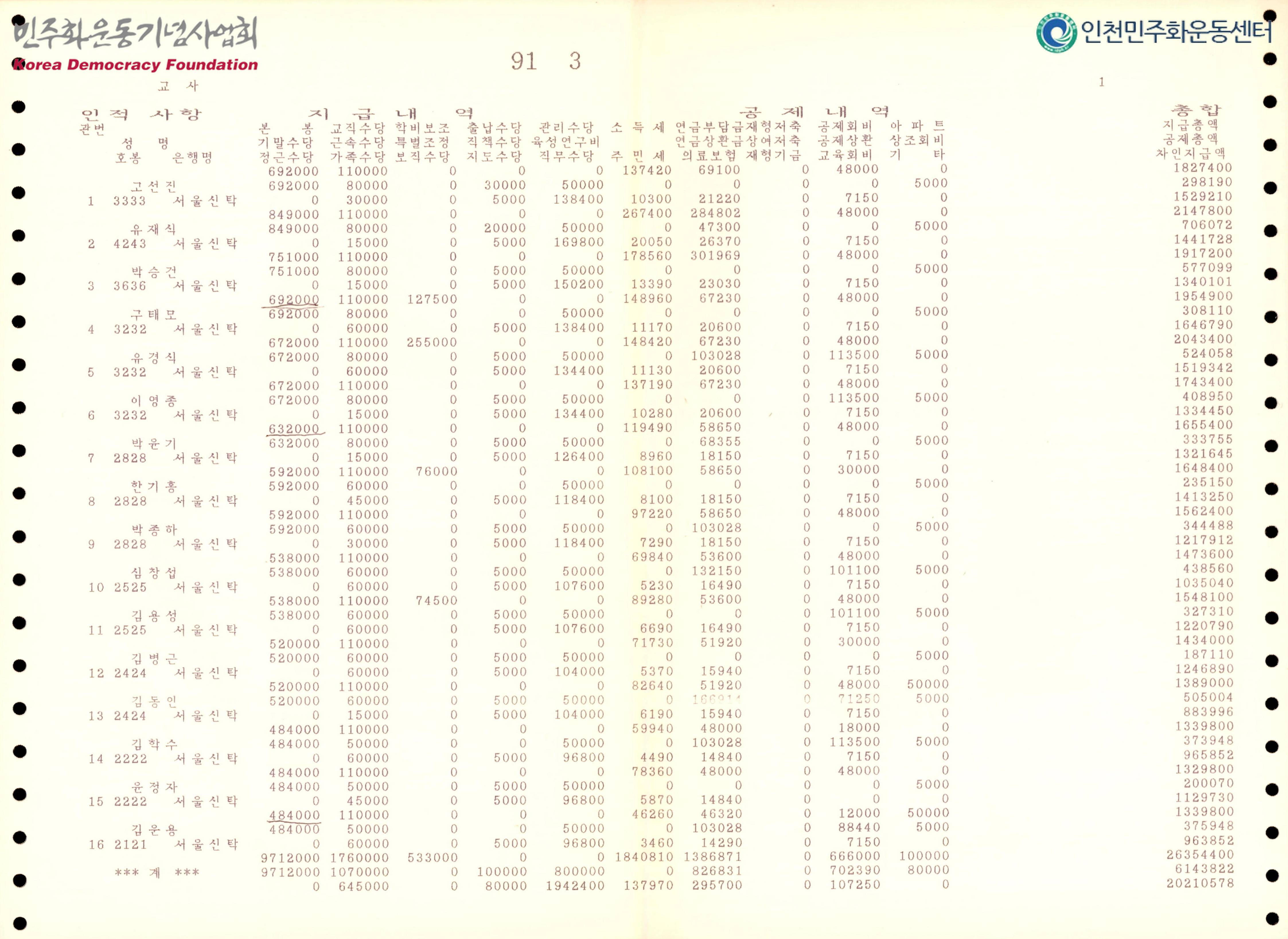- 91년도에 교사들에게 각 수당과 세금 공제 내역, 총 지급내역의 내용이 수록된 문서