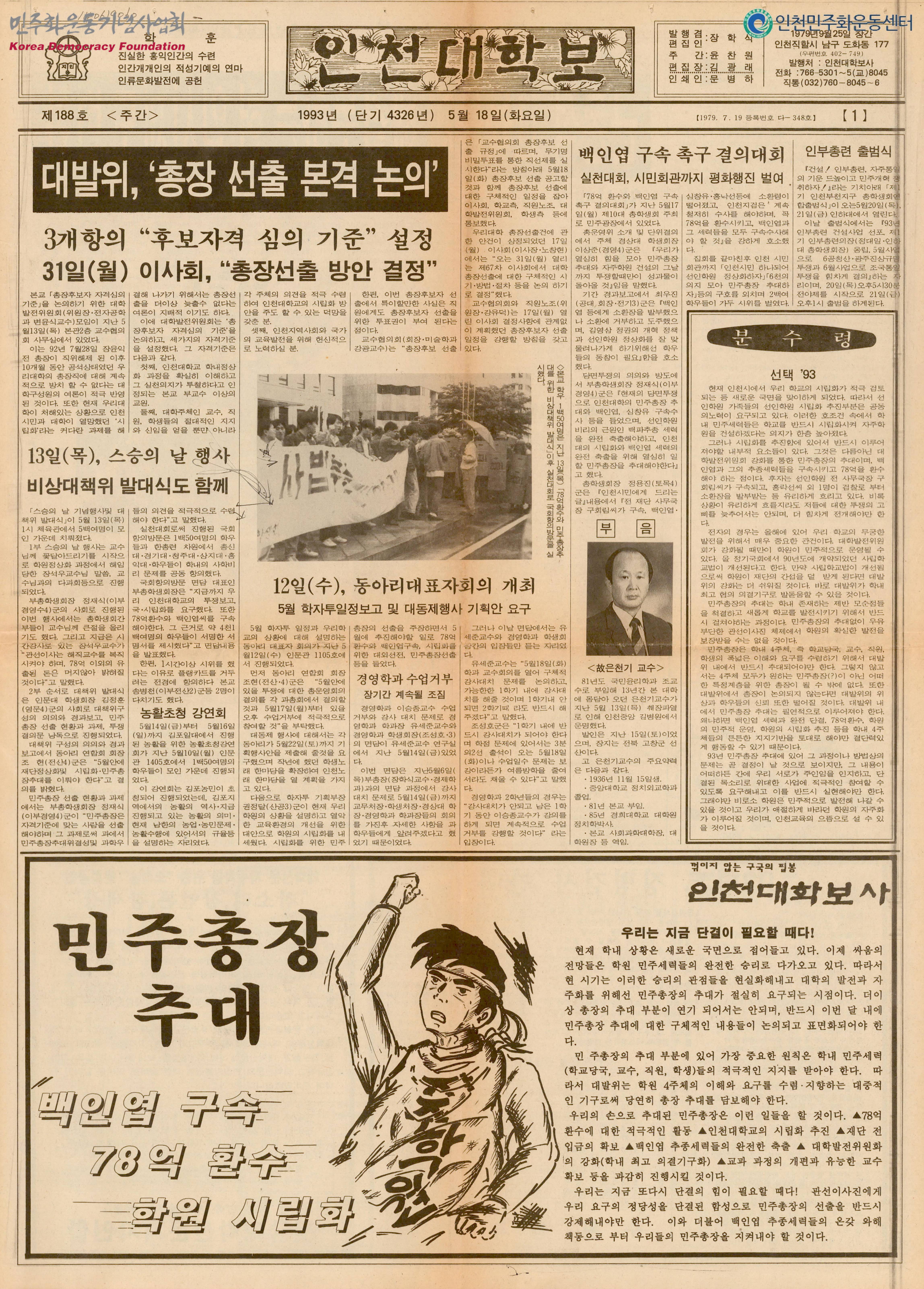 - 인천대학보 제188호로 주요 내용은 다음과 같음 -대발위, '총장 선출 본격 논의' -근본적 교육문제 해결못하는 현 입시제도 변화 -학내 연구소 유명무실, 재정부족이 큰 원인 -이번주, 본격적인 총장선출문제 대두될 전망