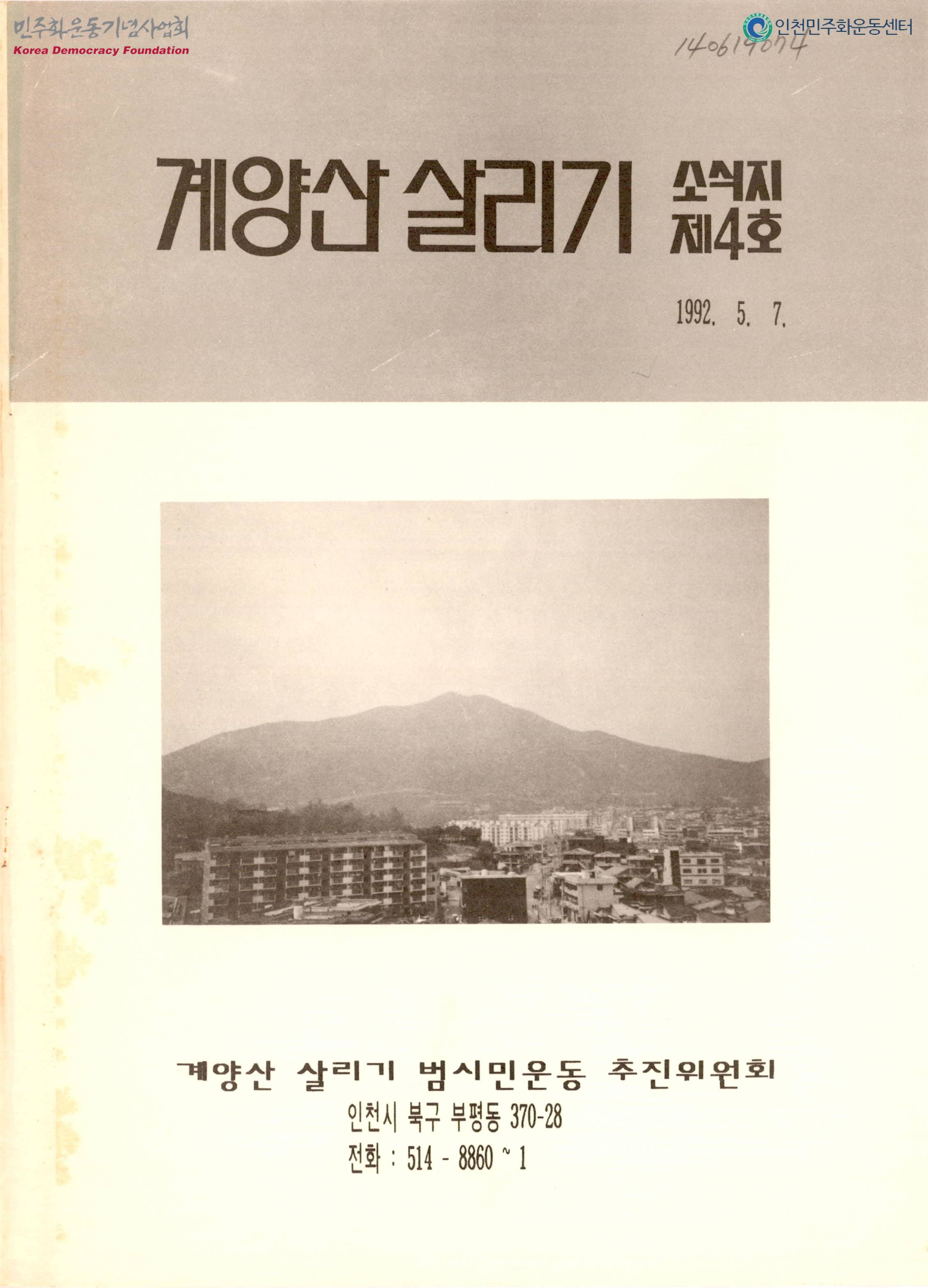 - 골프연승장 등 민자유치에 의한 계양산 개발에 반대하며 계양산 살리기 10만인 서명운동을 전개하며 계양산 살리기 범시민운동이 자리를 잡아가고 있다는 내용 등이 수록된 계양산 살리기 소식지 제4호로 주요 목차는 다음과 같음 -성명서: 걔양산 산불에 대한 철저한 원인규명을 촉구한다! -계양산 살리기 범시민운동 추진위원회 임원 명단 -계양산 살리기 범시민운동 추진위원회 추진위원 명부 -계양산 살리기 기금 모집 현황 -지출보고