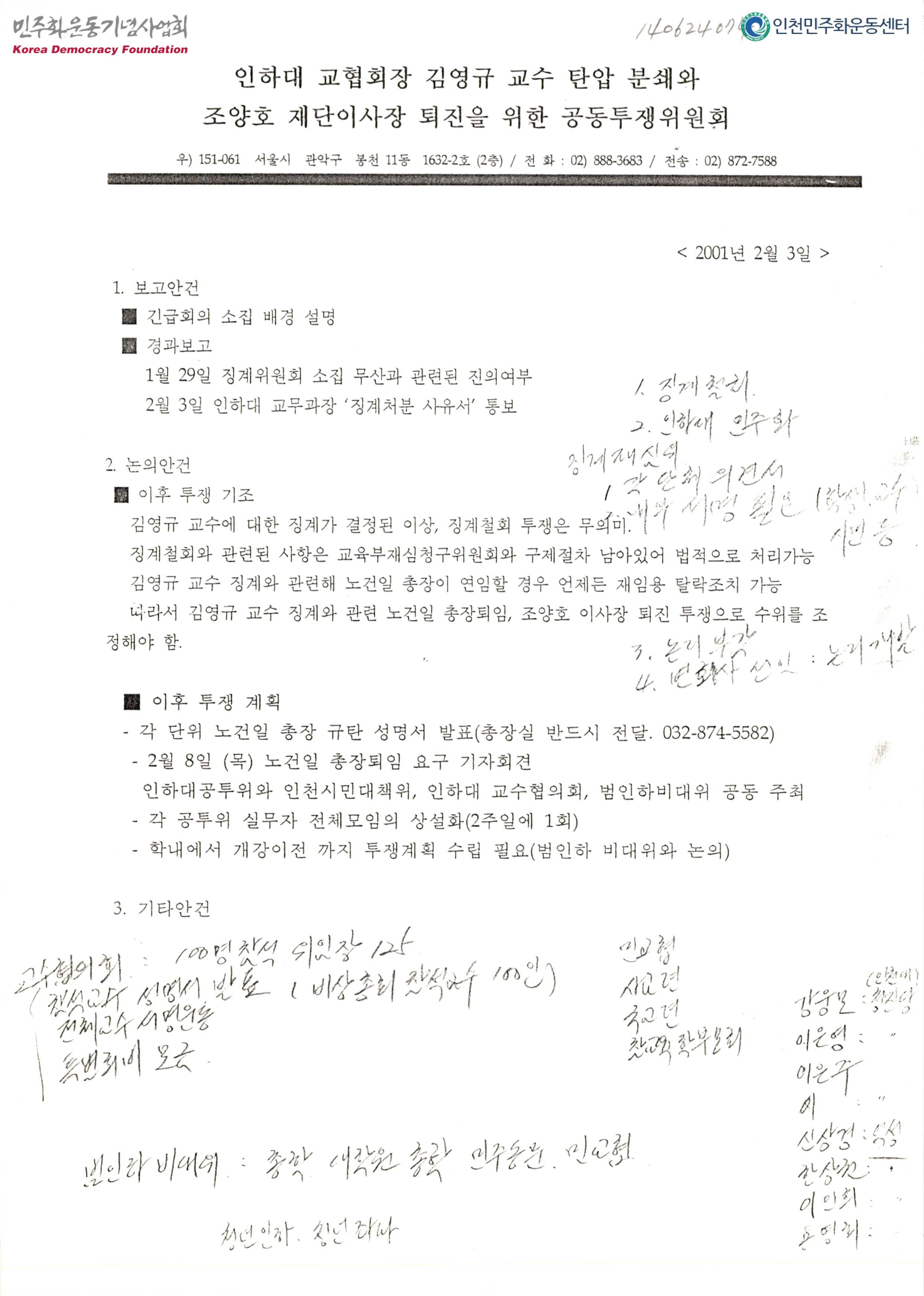 - 긴급회의 소집 배경 설명, 징계위원회 소집 무산과 관련된 진의여부, 인하대 교무과장 징계처분 사유서 통보 관련 보고안건, 징계 이후 투쟁 기조 및 투쟁 계획에 대한 논의안건 등의 내용이 수록된 문서로 인하대 교협회장 김영규 교수 탄압분쇄와 조양호 이사장 퇴진을 위한 공동투쟁위원회의 소속 단체의 전화번호 및 팩스번호, 이메일 주소 등이 적혀 있는 문서가 첨부되어 있음
