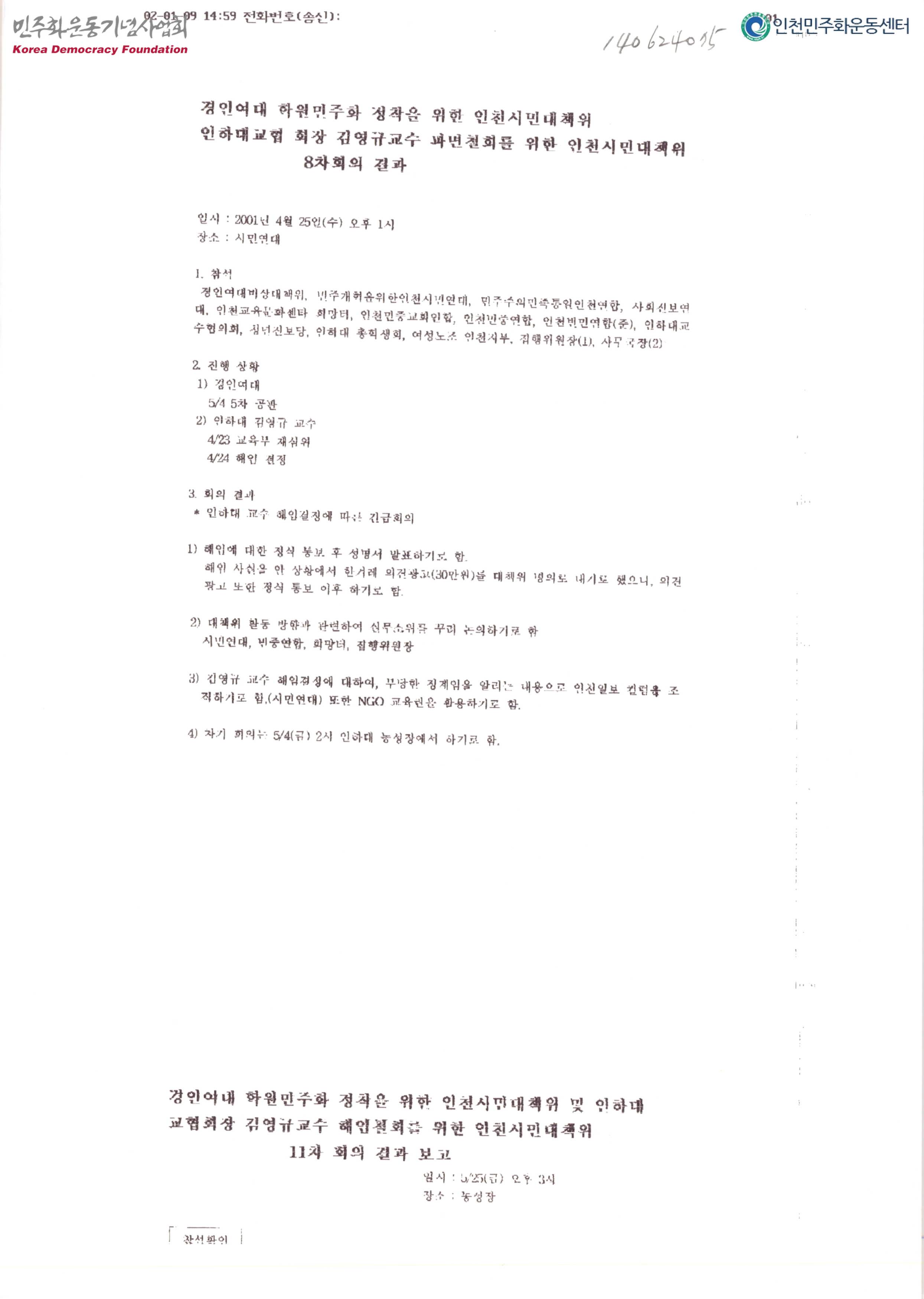 - 경인여자대학교학원민주화정착을위한인천시민대책위원회 및 인하대학교교수협의회장김영규교수해임철회를위한인천시민대책위원회