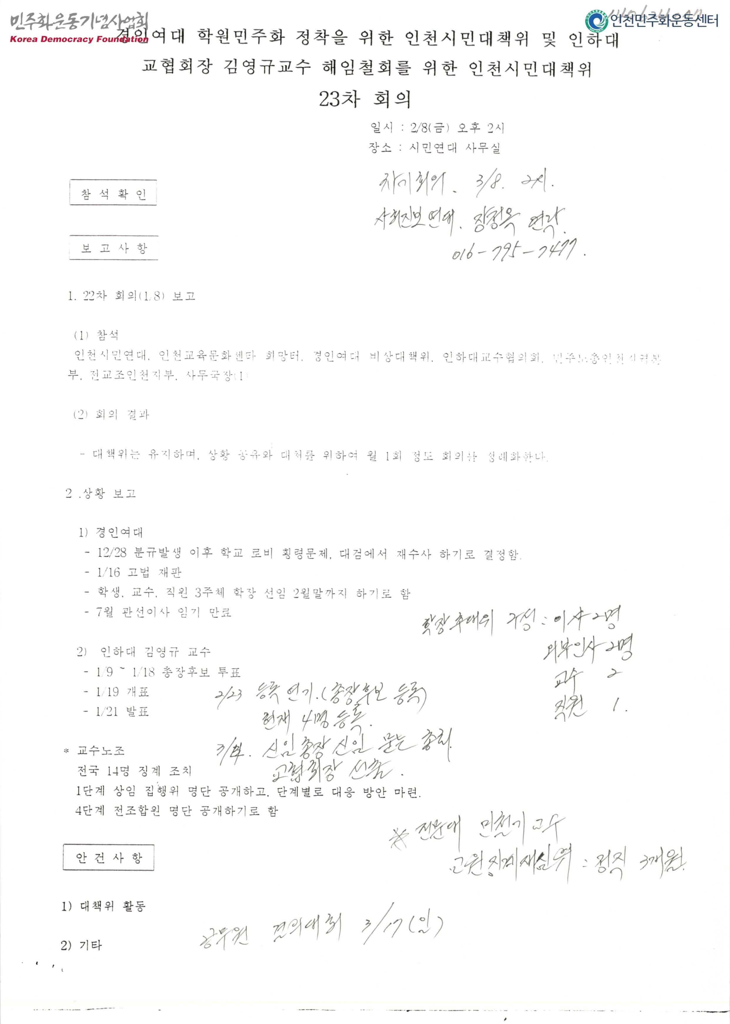 경인여대 학원민주화 정착을 위한 인천시민대책위 및 인하대 교협회장 김영규교수 해임철회를 위한 인천시민대책위 23차 회의