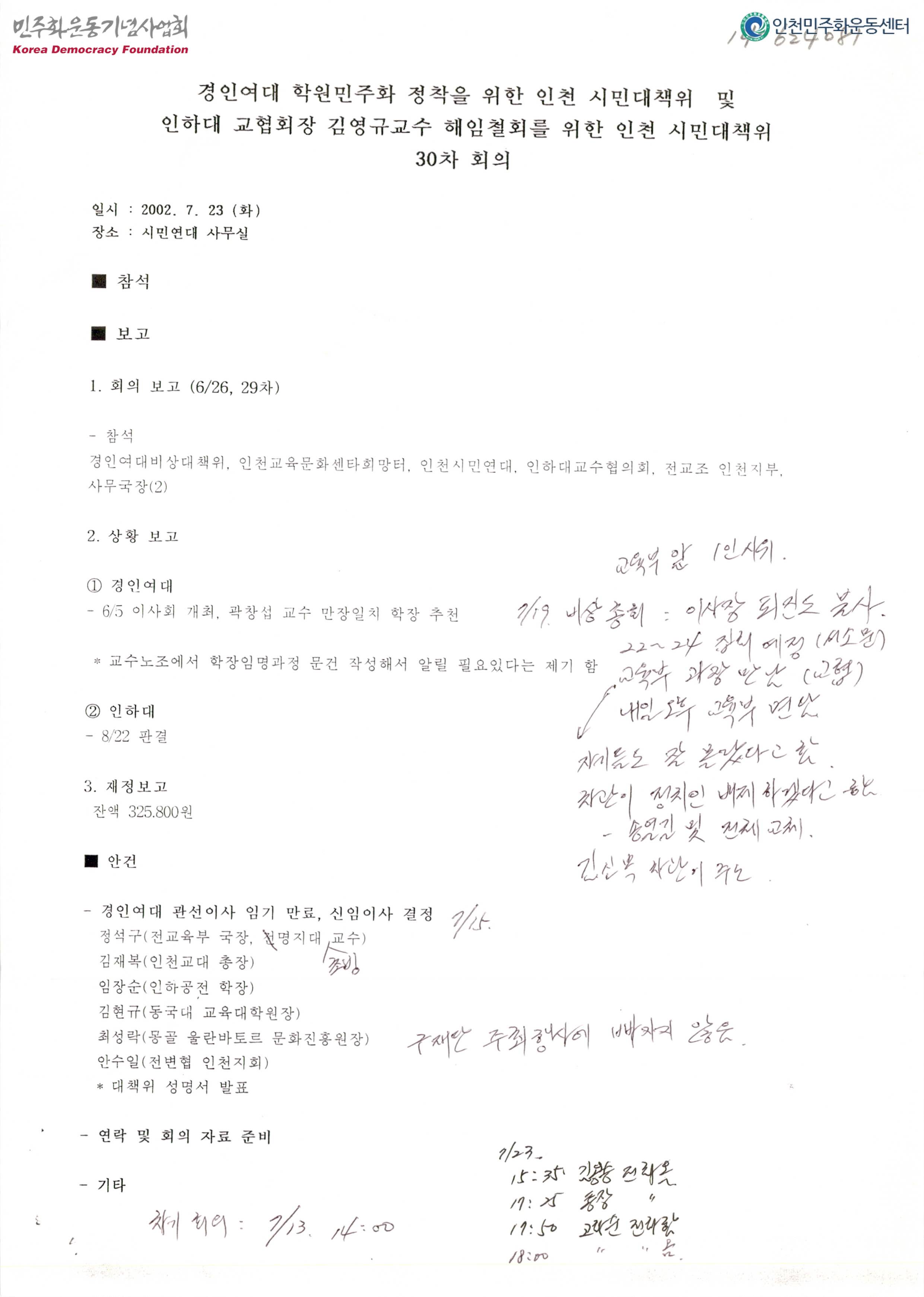 - 경인여자대학교학원민주화정착을위한인천시민대책위원회 및 인하대학교교수협의회장김영규교수해임철회를위한인천시민대책위원회