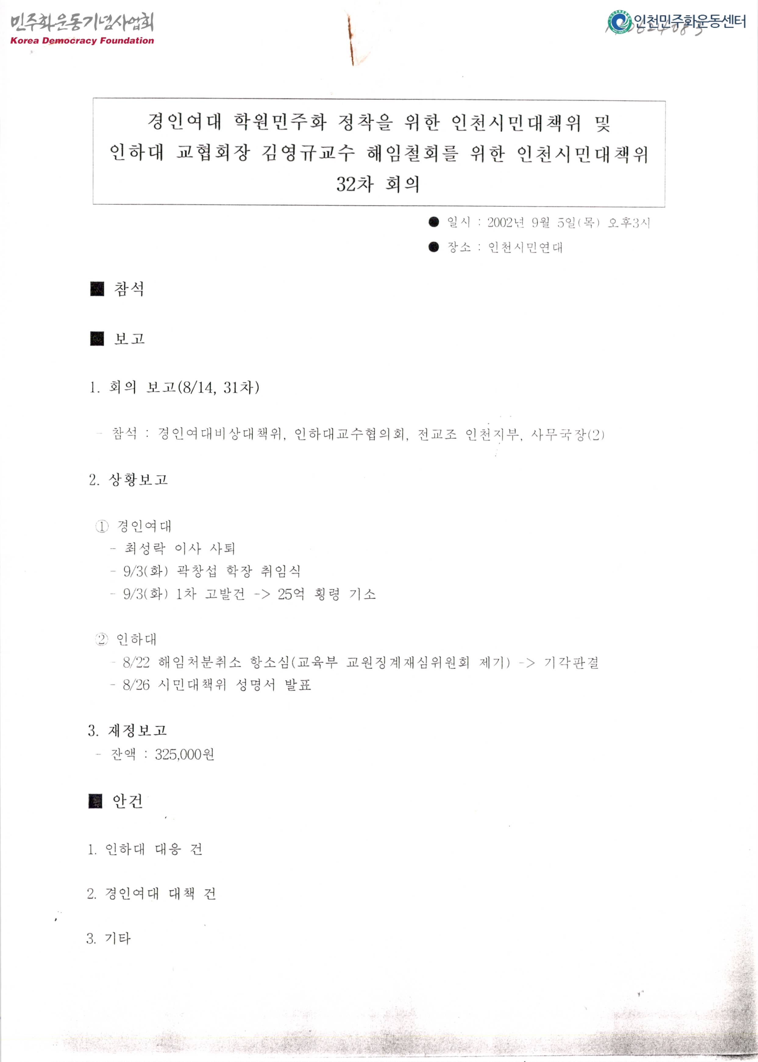 - 31차 회의 결과 보고, 최성락 이사 사퇴 및 곽창섭 학장 취임식 등의 경인여대 상황보고, 해임처분취소 항소심의 기각판결 및 시민대책위 성명서 발표 등의 인하대 상황보고, 인하대 대응 건 및 경인여대 대책 건 등의 안건 토의내용이 수록된 문서로 교육부와 인하대학교는 김영규 교수를 즉각 복직시켜야 한다는 성명서가 첨부되어 있음