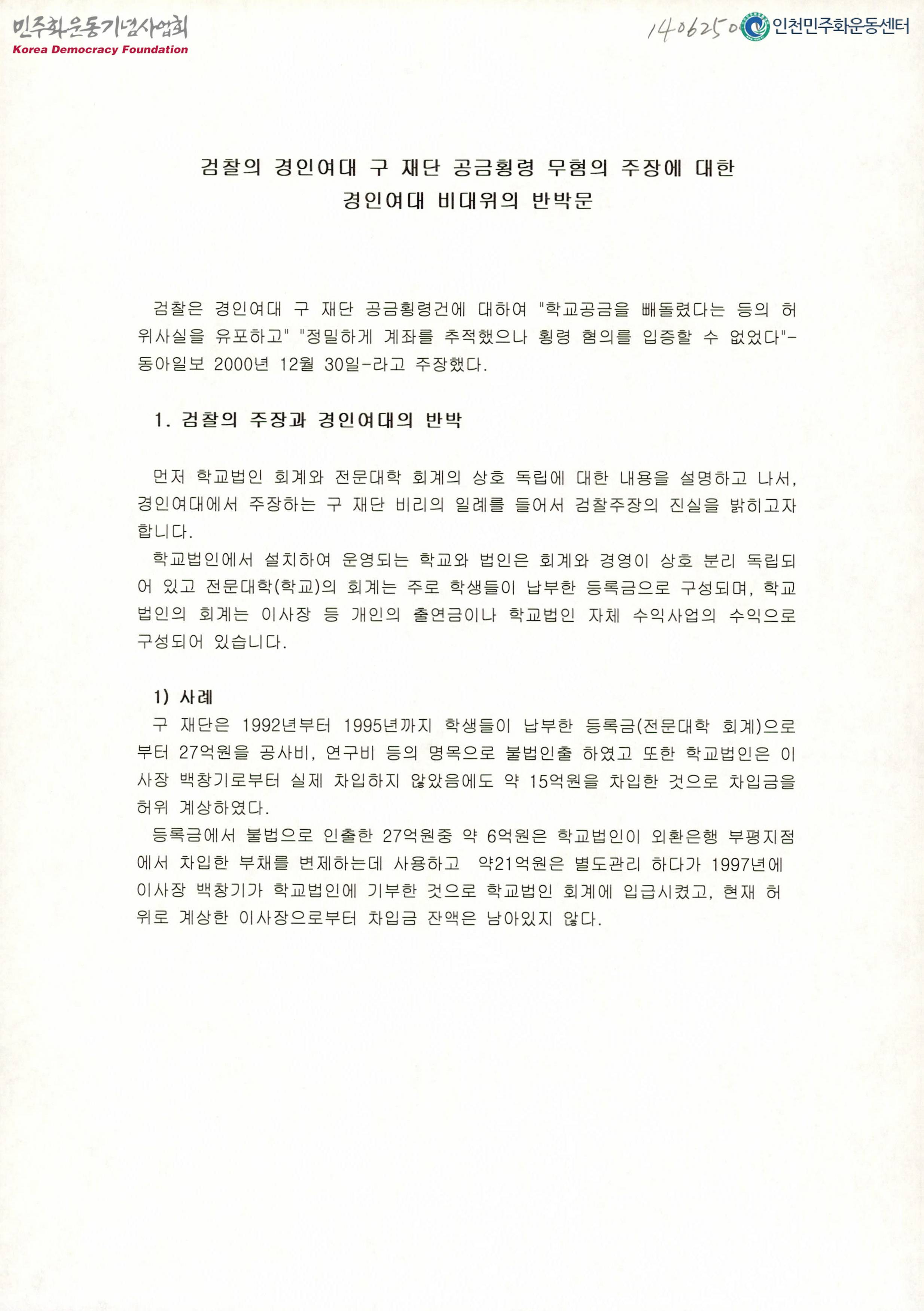 검찰의 경인여대 구 재단의 공금횡령 무혐의 주장에 대한 경인여대 비대위 반박문