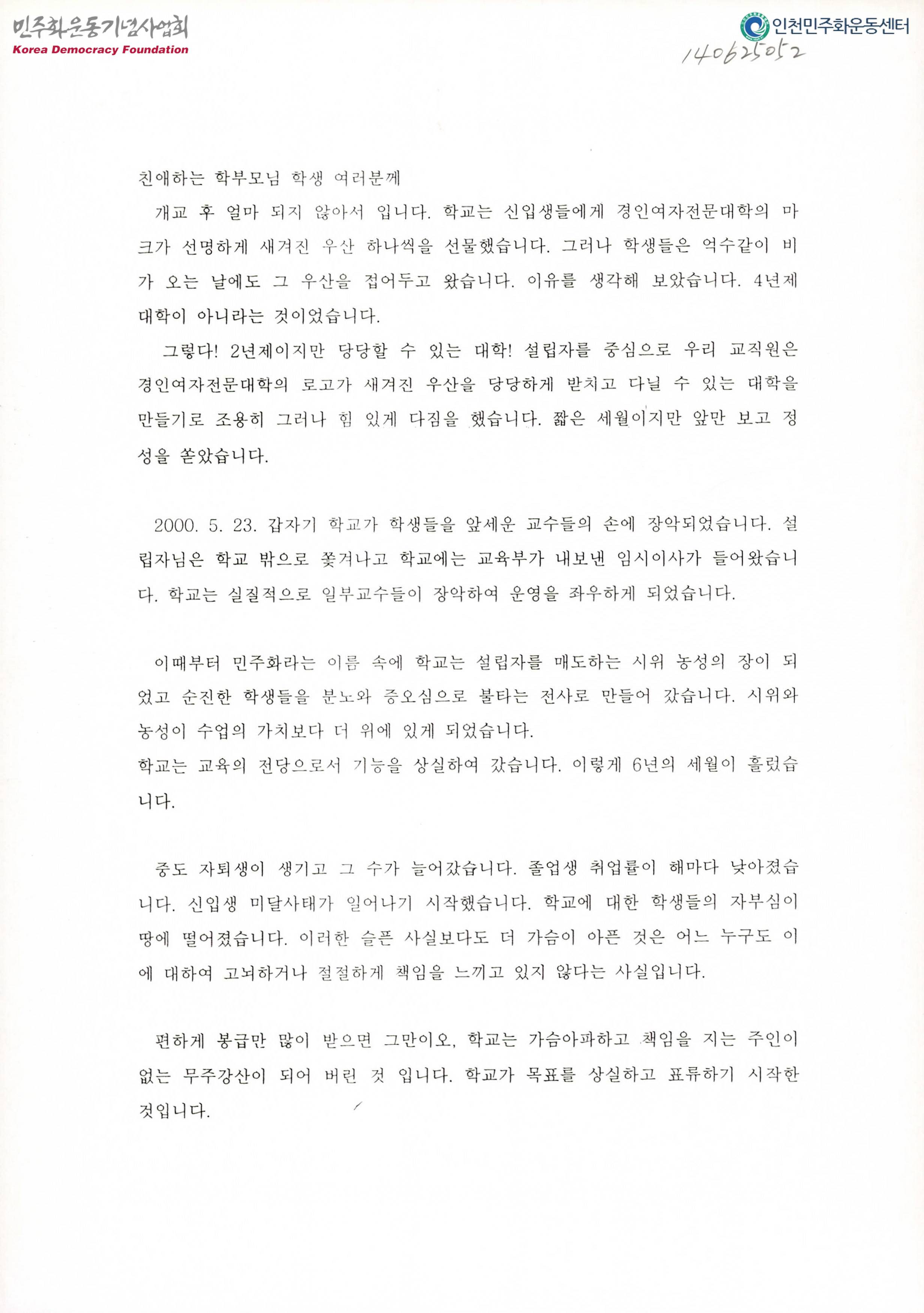 - 6년 동안의 학교분규로 학부모, 학생들에게 많은 염려와 걱정을 끼쳐 드린 점에 대해 뜻있는 교수들과 함께 깊이 사죄드리며 과거 학교분규를 거울삼아 학부모님 그리고 학생들이 긍지와 자부심을 느끼며 자랑스럽게 그리고 당당하게 어깨를 펴고 다닐 수 있는 경인여자대학의 재건에 정성을 다 바치도록 하겠다는 내용이 수록된 문서