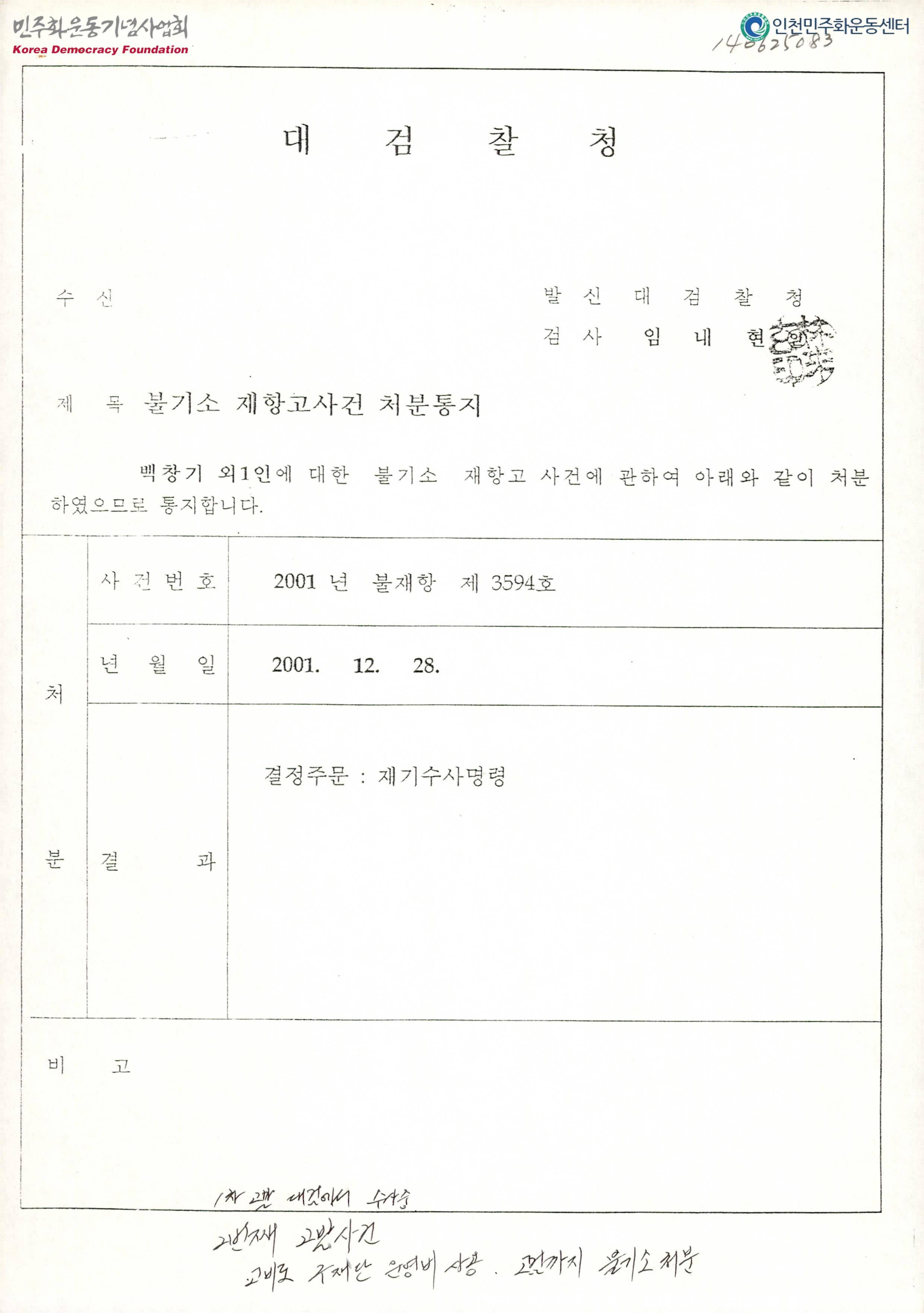 불기소 재항고사건 처분통지(사건번호 2001년 불재항 제3594호)