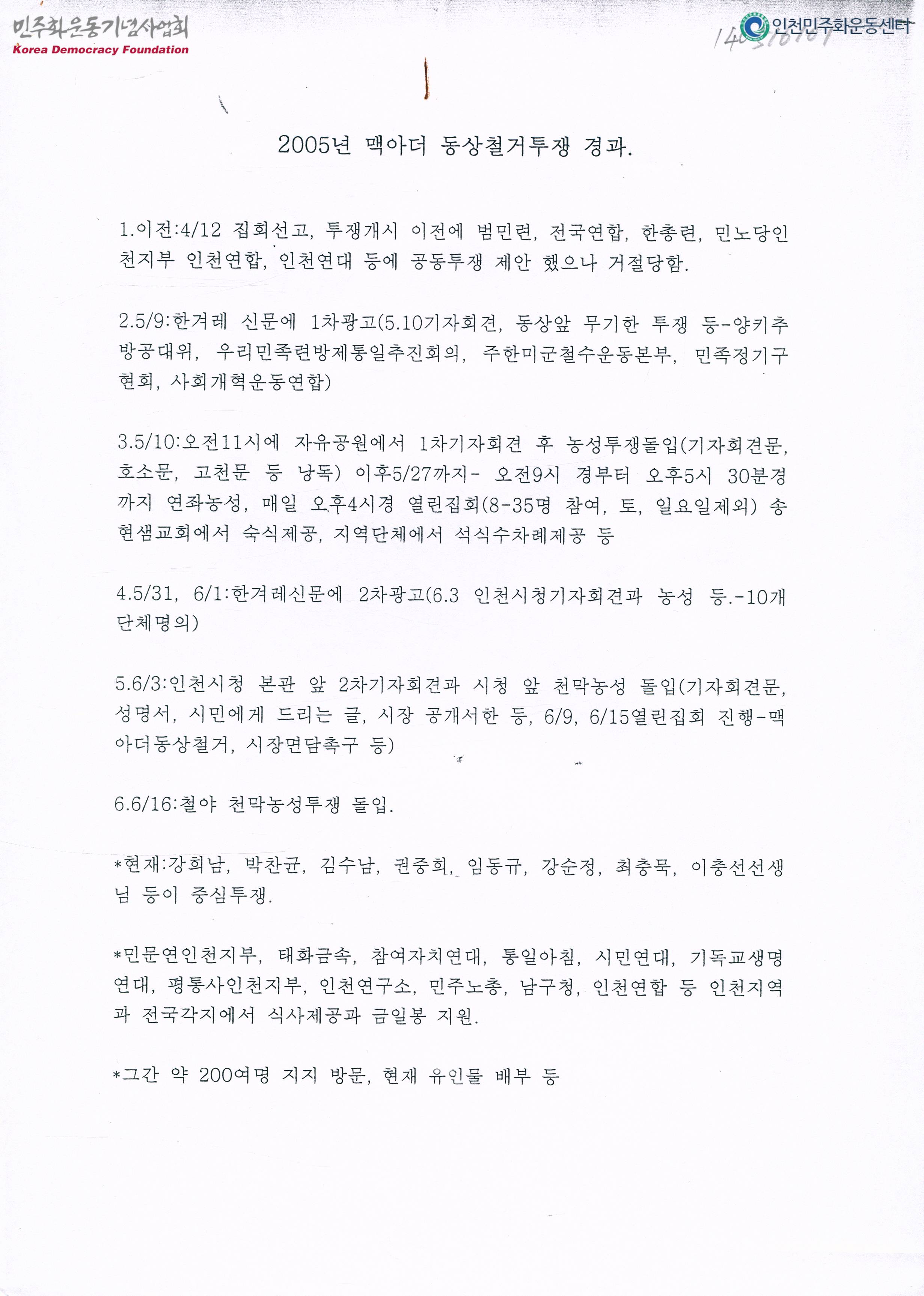 - 인천시 중구 자유공원의 맥아더 동상의 철거를 요구하는 2005년 투쟁의 경과가 담긴 문서