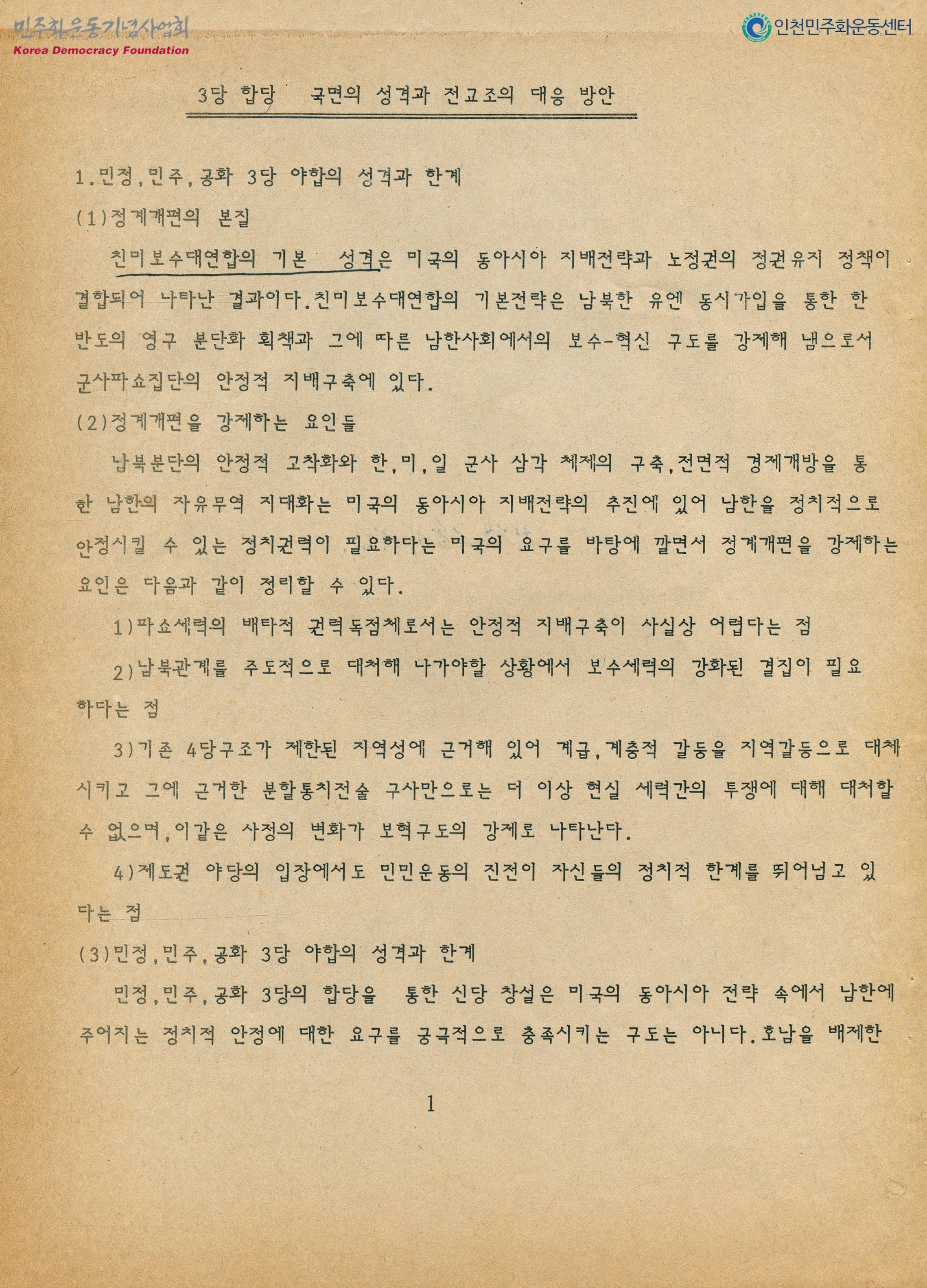 - 민정당, 민주당, 공화당의 야합의 성격과 한계를 분석하며, 3당 합당에 따른 정세 전선에 대한 예상과 지향점, 이로 인해 예상되는 교육부문의 변화, 현 국면에 대응하는 전교조의 자세와 방안 등을 제시하는 내용의 문서