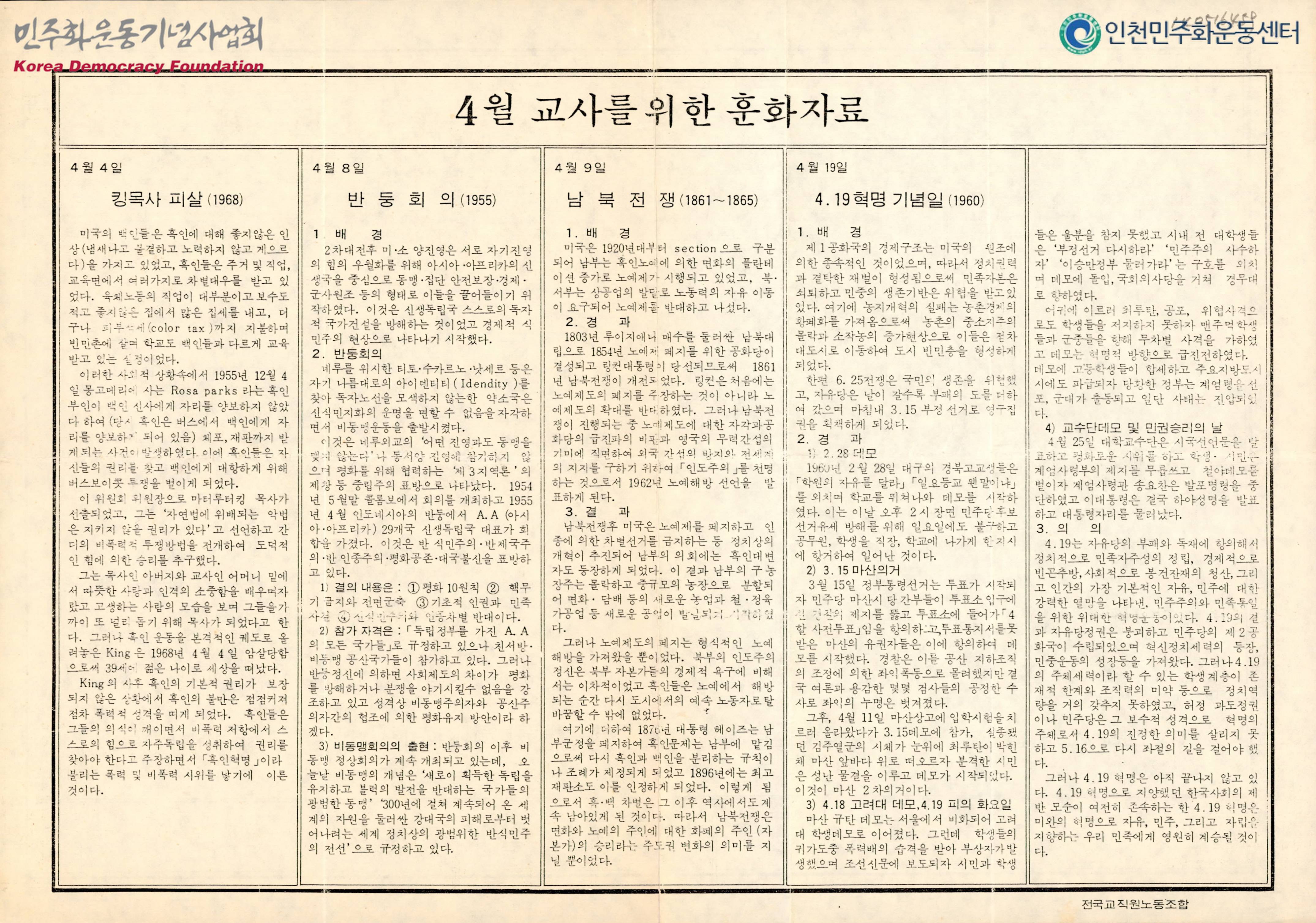 - 4월의 역사 훈화자료로 수록된 글은 다음과 같음 -킹목사 피살 -반둥회의 -남북전쟁 -4·19혁명 기념일 -무등산타잔사건 -지방자치제선거 실시 -함평 고구마사건 -윤봉길의사 의거일