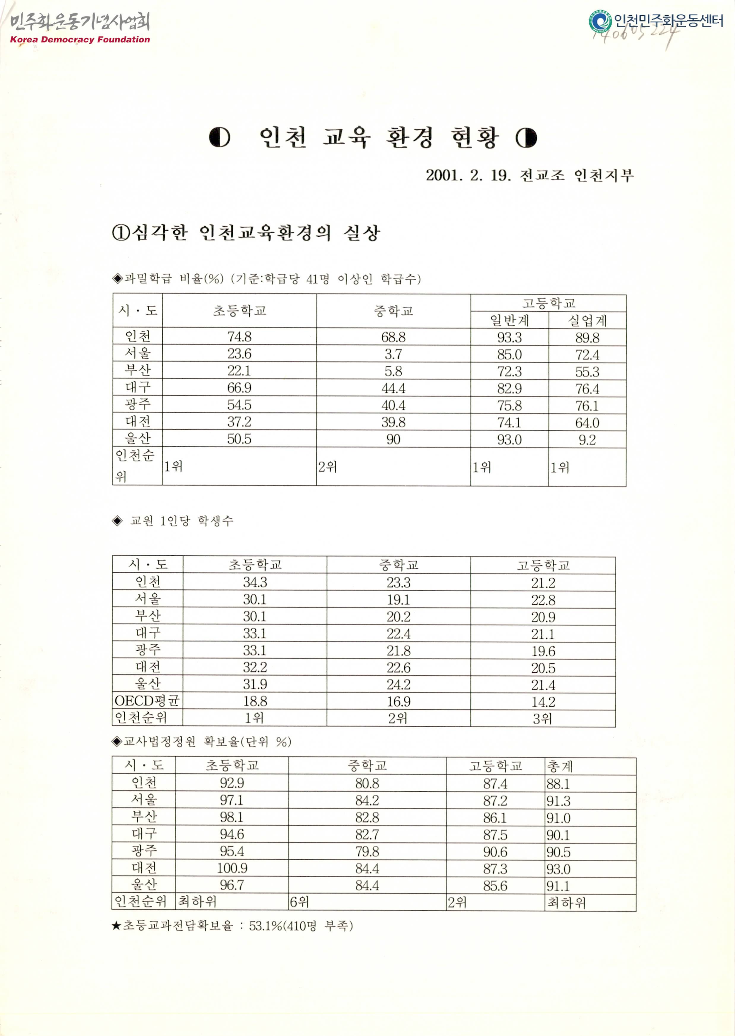 - 과밀학급의 비율, 교원 1인당 학생수, 교사법정정원 확보율등 인천지역의 교육환경 실상 현황표가 수록된 문서로 목차는 다음과 같음 1. 심각한 인천교육환경의 실상 2. 도서관도 사서교사도 부족합니다 3. 양호교사 없는 학교 최다